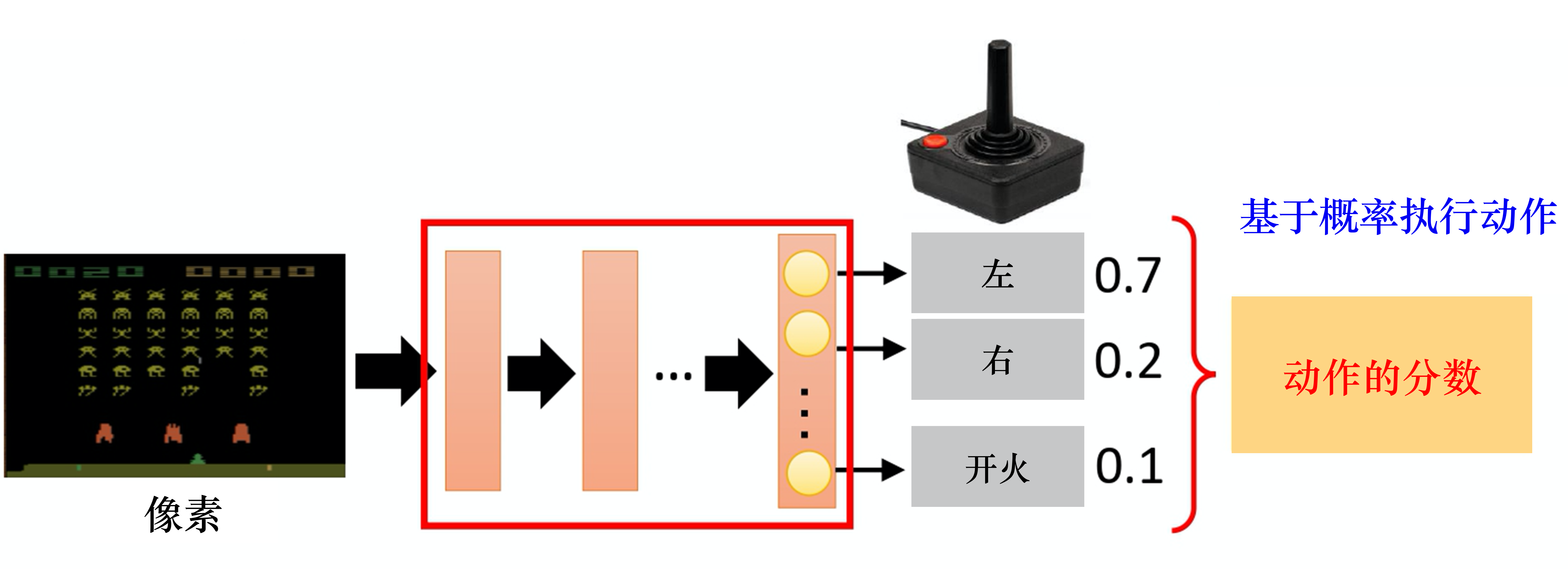 策略一般记作 $\pi$。假设我们使用深度学习来做强化学习,策略就是一个网络。网络里面有一些参数,我们用 $\theta$ 来代表 $\pi$ 的参数。网络的输入是智能体看到的东西,如果让智能体玩视频游戏,智能体看到的东西就是游戏的画面。智能体看到的东西会影响我们训练的效果。例如,在玩游戏的时候, 也许我们觉得游戏的画面是前后相关的,所以应该让策略去看从游戏开始到当前这个时间点之间所有画面的总和。因此我们可能会觉得要用到循环神经网络(recurrent neural network,RNN)来处理它,不过这样会比较难处理。我们可以用向量或矩阵来表示智能体的观测,并将观测输入策略网络,策略网络就会输出智能体要采取的动作。图 4.2 就是具体的例子,策略是一个网络;输入是游戏的画面,它通常是由像素组成的;输出是我们可以执行的动作,有几个动作,输出层就有几个神经元。假设我们现在可以执行的动作有 3 个,输出层就有 3 个神经元,每个神经元对应一个可以采取的动作。输入一个东西后,网络会给每一个可以采取的动作一个分数。我们可以把这个分数当作概率,演员根据概率的分布来决定它要采取的动作,比如 0.7 的概率向左走、0.2 的概率向右走、0.1的概率开火等。概率分布不同,演员采取的动作就会不一样。
