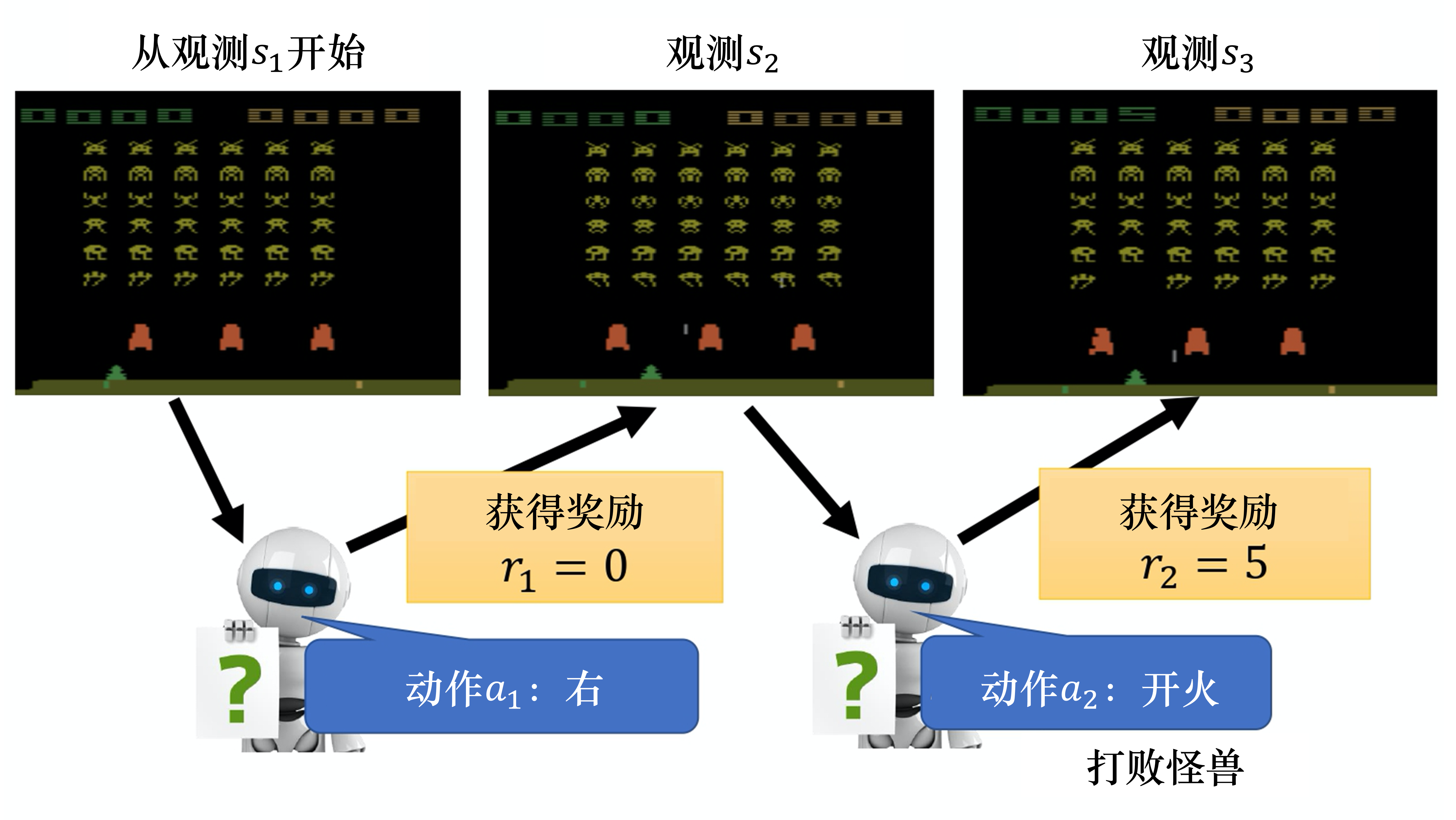 我们把游戏初始的画面记作 $s_1$, 把第一次执行的动作记作 $a_1$,把第一次执行动作以后得到的奖励记作 $r_1$。不同的人有不同的记法,有人觉得在 $s_1$ 执行 $a_1$ 得到的奖励应该记为 $r_2$,这两种记法都可以。演员决定一个动作以后,就会看到一个新的游戏画面$s_2$。把 $s_2$ 输入给演员,演员决定要开火,它可能打败了一只怪兽,就得到五分。这个过程反复地持续下去,直到在某一个时间点执行某一个动作,得到奖励之后,环境决定这个游戏结束。例如,如果在这个游戏里面,我们控制宇宙飞船去击杀怪兽,如果宇宙飞船被毁或是把所有的怪兽都清空,游戏就结束了。
