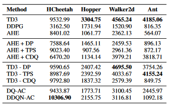 # TD3: Addressing Function Approximation Error in Actor-Critic Methods 论文剖析 Scott Fujimoto, Herke van Hood, David Meger ## 一、文章信息 **** **Addressing Function Approximation Error in Actor-Critic Methods** https://arxiv.org/abs/1802.09477 https://github.com/sfujim/TD3 ## 二、写作动机 在Q-learning中,噪声源自函数逼近中无法避免的不精确估计。这种不精确估计在每次更新时被不断累加,并通过估计的最大化被不断估计为高值,导致高估问题(OverStimation)。作为DQN的拓展,DDPG在解决连续控制问题时也会存在高估问题。 本文借鉴Double DQN解决DQN中高估问题时的经验,解决连续动作控制问题中出现的高估问题。 ## 三、相关工作 ### 1. DDPG DDPG解决了DQN不能用于连续控制的问题,采用基于DPG的Actor-Critic结构。其Actor部分采用估计网络 $\mu_\theta(s)$ 负责输出确定性动作,其目标网络与估计网络结构相同但参数不同,主要负责更新价值网络Critic;Critic部分负责价值函数 $Q_{\omega}(s,a)$ 的拟合,其估计网络以Actor估计网络的输出动作为输入,参与Actor和Critic的优化。目标网络Critic参与Critic优化时 $Q_{target}$ 的计算。 价值网络Critic的更新主要基于TD-error的梯度下降,具体更新公式如下: $$ L_{critic}=\frac{1}{N}\sum_{i}(y_i-Q(s_i,a_i|\theta^{Q}))^2 $$ 策略网络Actor的更新则是基于梯度上升,从而最大化价值网络输出的Q值,其更新公式如下: $$ \nabla_{\theta^\mu}J \approx \frac{1}{N}\sum_i\nabla_aQ(s,a|\theta^Q)|_{s=s_i,a=\mu(s_i)} \nabla_{\theta^\mu}\mu(s|\theta^{\mu})|_{s_i} $$ ### 2. Double DQN 针对DQN中出现的高估问题,Double DQN使用两个独立的估计量来进行无偏估计。其将传统DQN中最优动作选取与最优动作价值函数计算进行解耦,采用目标网络 $\theta^-$ 与策略网络 $\theta$ 分别进行计算,具体计算形式如下: $$ a^*=\substack{argmax\\{a \in \mathbb{A}}}Q(s,a|\theta_t^-)\\Y_t^Q=r+\gamma Q(S_t=s, A_t=a^*;\theta_t) $$ 通过减少traget的过估计,Double DQN减少了对动作价值函数的估计。 ### 3. Averaged-DQN Averaged-DQN提出了一种不同的高估问题解决方法,其聚焦于方差最小化,通过平均Q值来降低target近似方差(TAE),并且不同于Ensemble DQN,Averaged-DQN中采用最近K个版本的Q Function计算平均目标,通过采用过去的target network来避免K-Fold计算,获得更好的方差化简结果,对Variance的计算形式如下: $$ Var[Q^A_i(s_0,a)]=\sum^{M-1}_{m=0}D_{K,m}\gamma^{2m}\sigma^2_{s_m} $$ Averaged-DQN的计算公式如下: $$ Q^A_N(s,a)=\frac{1}{K} \sum^{K-1}_{k=0}Q(s,a;\theta_{N-k}) $$ ## 四、TD3 在Double DQN中,高估问题通过解耦最优动作选取与最优动作价值函数计算得到了缓解,这种思路在TD3中得到了延续。作为Actor-Critic框架下的确定性强化学习算法,TD3结合了深度确定性策略梯度算法和双重网络,在缓解DDPG算法的高估问题时取得了优秀表现。 ### 1. 双重网络 不同于DDPG中Actor-Target Actor和Critic-Target Critic的四网络结构,TD3算法在DDPG的基础上新增了一套Critic_2网络。两个Target Critic网络计算出各自的Q-target后,选取 $\min(targetQ_1,targetQ_2)$ 作为原DDPG中 $Q(a')$ 的替代去计算更新目标Q-target,公式如下: $$ Y_{target} = r+\gamma \min(targetQ_1, targetQ_2) $$ 两个Critic网络根据Actor的输出分别计算出各自的值 $Q_1,Q_2$ 后,通过 $MSE$ 计算Q值与Q-target之间的Loss,进行参数更新,公式如下: $$ \theta_i = argmin_{\theta_i}\frac{1}{N}\sum(y-Q_{\theta_i}(s,a))^2 $$ 当Critic网络更新完成后,Actor网络采用延时更新的方法,通过梯度上升自我更新。target网络则是采用软更新的方式进行更新,二者更新公式如下: $$ Actor:\ \nabla_{\phi}J(\phi)=\frac{1}{N} \sum\nabla_aQ_{\theta_1}(s,a)|a=\pi_{\phi}(s)\nabla_{\phi}\pi_{\phi}(s) \\ target:\ \theta=\tau\theta'+(1-\tau)\theta $$ ### 2. 目标策略平滑正则化 DDPG中采用的确定性策略会在更新Critic网络时极易被函数逼近误差所影响,致使目标估计的方差值增大,估值异常。TD3中引入了平滑化思想(Smoothing),通过向目标动作中添加正态分布噪声并求平均值来近似动作期望,本质是一种正则化方法,采用噪声来平滑掉Q峰值,从而防止其过拟合。公式表示为: $$ a'=\pi_{\phi'}(s')+\epsilon, \\ \epsilon \sim clip(N(0, \tilde \sigma), -c,c) $$ ### 3. 延迟更新 在训练Actor和Critic网络时,文章发现Actor与Critic之间的相互作用会导致Actor一直在被动的跟随Critic网络进行更新,这种不稳定的状态会使得策略函数会根据不准确的估值朝着错误方向进行更新,并在多次更新中累积这些差异,最终陷入劣化循环。因此Actor网络需要一个稳定的Critic网络来协助其进行更新。 文章调高了Critic网络的更新频率,使其高于Actor。保证先尽可能的降低估计误差,确保TD-error足够小。待获得更加稳定的结果后再去协助Actor网络进行更新。 ## 五、实验环节 ### 1. 评估 本文采用MuJoCo连续控制任务对TD3与PPO、DDPG及其他算法进行评估,其中DDPG模型通过一个两层的前馈神经网络实现,并在每层之间对Actor和Critic均采用了ReLU和Tanh单元,同时作者还针对原始DDPG算法进行了修改,将状态和动作共同接受并输入第一层中。两个网络参数都采用Adam进行更新,设置学习率为$10^{-3}$。 目标策略平滑通过添加 $\epsilon \sim N(0, 0.2)$ 实现,将其剪辑到区间$(-0.5,0.5)$。延迟更新策略设置每2次迭代更新Actor与Target Critic。在进行软更新时,设置 $\tau=0.005$。 在HalfCheetah-v1、Hopper-v1等环境中学习曲线越靠上,算法效果越好。具体结果如下图所示: ![](img\TD_1.png) 可见TD3算法的性能相较于其他算法有较明显提升。 ### 2. 消融实验 本节作者针对延迟更新策
