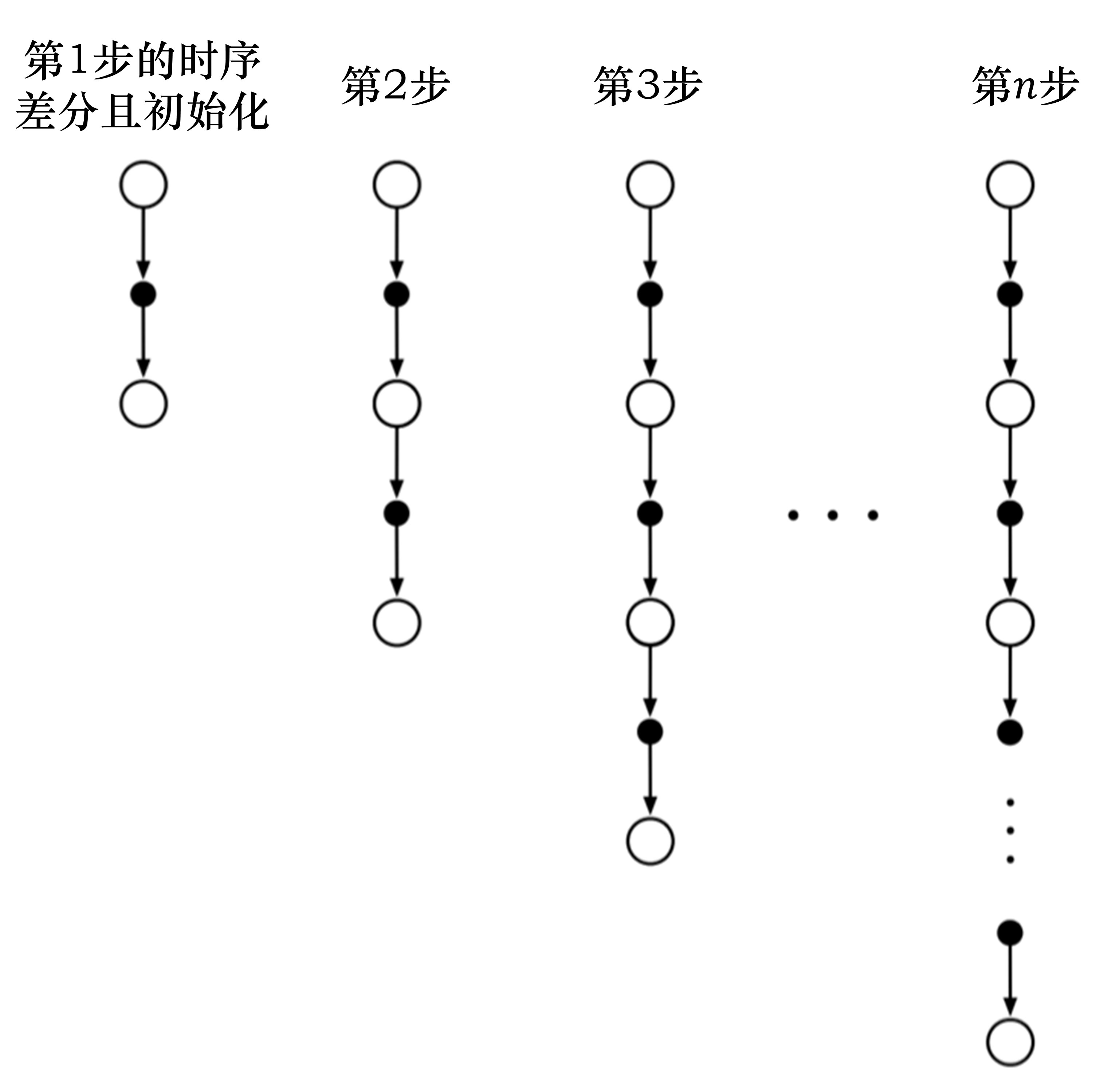 我们考虑 $n$ 步的回报($n=1,2,\cdots,\infty$),如式(3.5)所示。Sarsa 属于单步更新算法,每执行一个动作,就会更新一次价值和策略。如果不进行单步更新,而是采取 $n$ 步更新或者回合更新,即在执行 $n$ 步之后再更新价值和策略,这样我们就得到了 **$n$ 步 Sarsa($n$-step Sarsa)**。