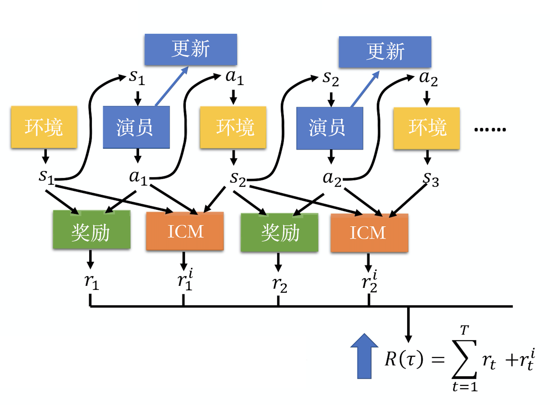 在好奇心驱动的技术里面,我们会加上一个新的奖励函数------**内在好奇心模块(intrinsic curiosity module,ICM)**,它用于给智能体加上好奇心。内在好奇心模块需要 3 个输入:状态$s_1$、动作 $a_1$ 和状态$s_2$。根据输入,它会输出另外一个奖励$r_1^i$。对智能体来说,总奖励并不是只有 $r$,还有 $r^i$。它不是只把所有的 $r$ 都加起来,它还把所有 $r^i$ 加起来当作总奖励。所以在与环境交互的时候,它不是只希望 $r$ 越大越好,它还同时希望 $r^i$ 越大越好,它希望从内在好奇心模块里面得到的奖励越大越好。内在好奇心模块代表一种好奇心。