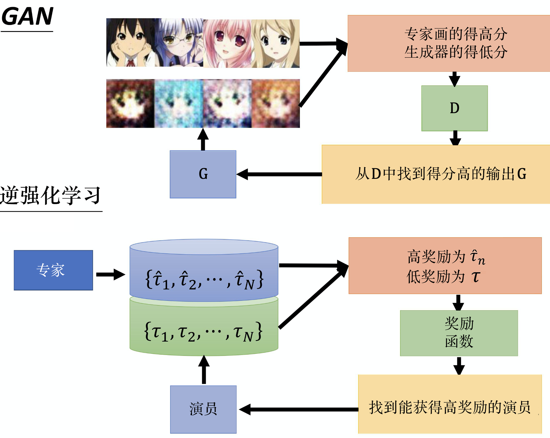 图 11.8 生成对抗网络与逆强化学习的区别