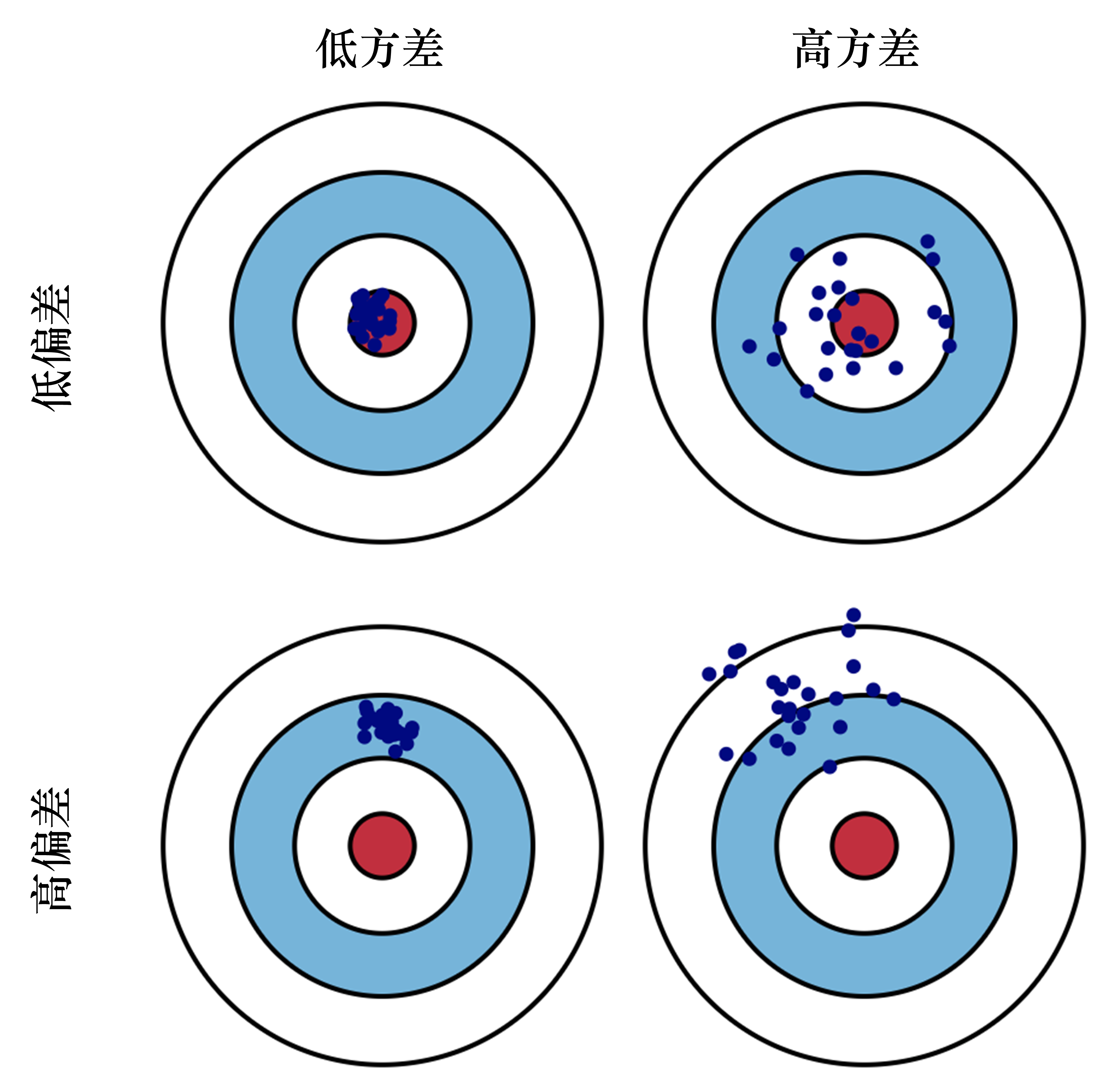 方差(variance):描述的是预测值的变化范围、离散程度,也就是离其期望值的距离。方差越高,数据的分布越分散,如图 3.27 右列所示。