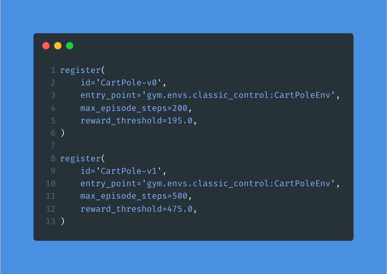 ```CartPole v1```环境其实跟```CartPole v0```是一模一样的,区别在于每回合最大步数(max_episode_steps)以及奖励阈值(reward_threshold),如下是相关源码: