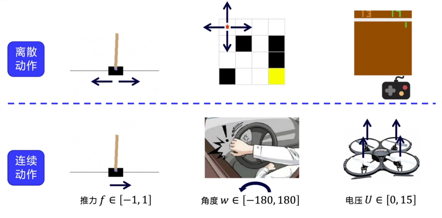 # 第12章 深度确定性策略梯度 ## 12.1 离散动作与连续动作的区别 离散动作与连续动作是相对的概念,一个是可数的,一个是不可数的。 如图 12.1 所示,离散动作和连续动作有几个例子。在 *CartPole* 环境中,可以有向左推小车、向右推小车两个动作。在 *Frozen Lake* 环境中,小乌龟可以有上、下、左、右4个动作。在雅达利的 *Pong* 游戏中,游戏有 6 个按键的动作可以输出。但在实际情况中,我们经常会遇到连续动作空间的情况,也就是输出的动作是不可数的。比如:推小车推力的大小、选择下一时刻方向盘转动的具体角度、给四轴飞行器的4个螺旋桨给的电压的大小。