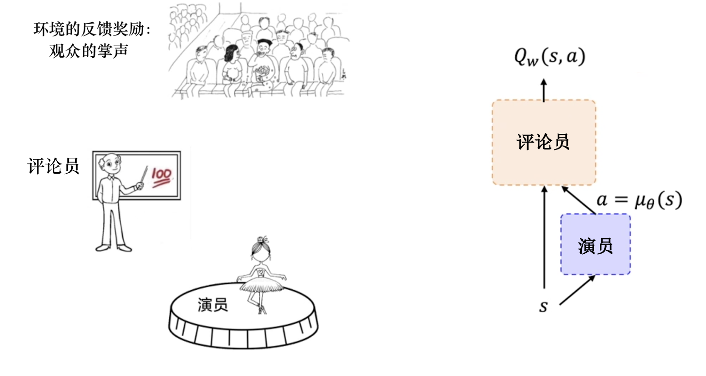 通俗地解释一下演员-评论员结构。如图 12.6 所示,策略网络扮演的就是演员的角色,它负责对外展示输出,输出动作。Q 网络就是评论员,它会在每一个步骤都对演员输出的动作做一个评估,打一个分,估计演员的动作未来能有多少奖励,也就是估计演员输出的动作的 Q 值大概是多少,即 $Q_w(s,a)$。演员需要根据舞台目前的状态来做出一个动作。评论员就是评委,它需要根据舞台现在的状态和演员输出的动作对演员刚刚的表现去打一个分数 $Q_w(s,a)$。演员根据评委的打分来调整自己的策略,也就是更新演员的神经网络参数 $\theta$,争取下次可以做得更好。评论员则要根据观众的反馈,也就是环境的反馈奖励来调整自己的打分策略,也就是要更新评论员的神经网络的参数 $w$ ,评论员的最终目标是让演员的表演获得观众尽可能多的欢呼声和掌声,从而最大化未来的总收益。 最开始训练的时候,这两个神经网络的参数是随机的。所以评论员最开始是随机打分的,演员也随机输出动作。但是由于有环境反馈的奖励存在,因此评论员的评分会越来越准确,所评判的演员的表现也会越来越好。既然演员是一个神经网络,是我们希望训练好的策略网络,我们就需要计算梯度来更新优化它里面的参数 $\theta$ 。简单来说,我们希望调整演员的网络参数,使得评委打分尽可能高。注意,这里的演员是不关注观众的,它只关注评委,它只迎合评委的打分 $Q_w(s,a)$。