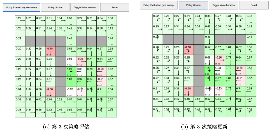 首先我们来看看策略迭代,之前的例子在每个状态都采取固定的随机策略,每个状态都以 0.25 的概率往上、下、左、右,没有策略的改变。但是我们现在想进行策略迭代,每个状态的策略都进行改变。如图 2.25a 所示,我们先执行一次策略评估,得到价值函数,每个状态都有一个价值函数。如图 2.25b 所示,我们接着进行策略改进,单击“策略更新(policy update)”,这时有些格子里面的策略已经产生变化。比如对于中间 $-$1 的这个状态,它的最佳策略是往下走。当我们到达 $-$1 状态后,我们应该往下走,这样就会得到最佳的价值。绿色右边的格子的策略也改变了,它现在选取的最佳策略是往左走,也就是在这个状态的时候,最佳策略应该是往左走。