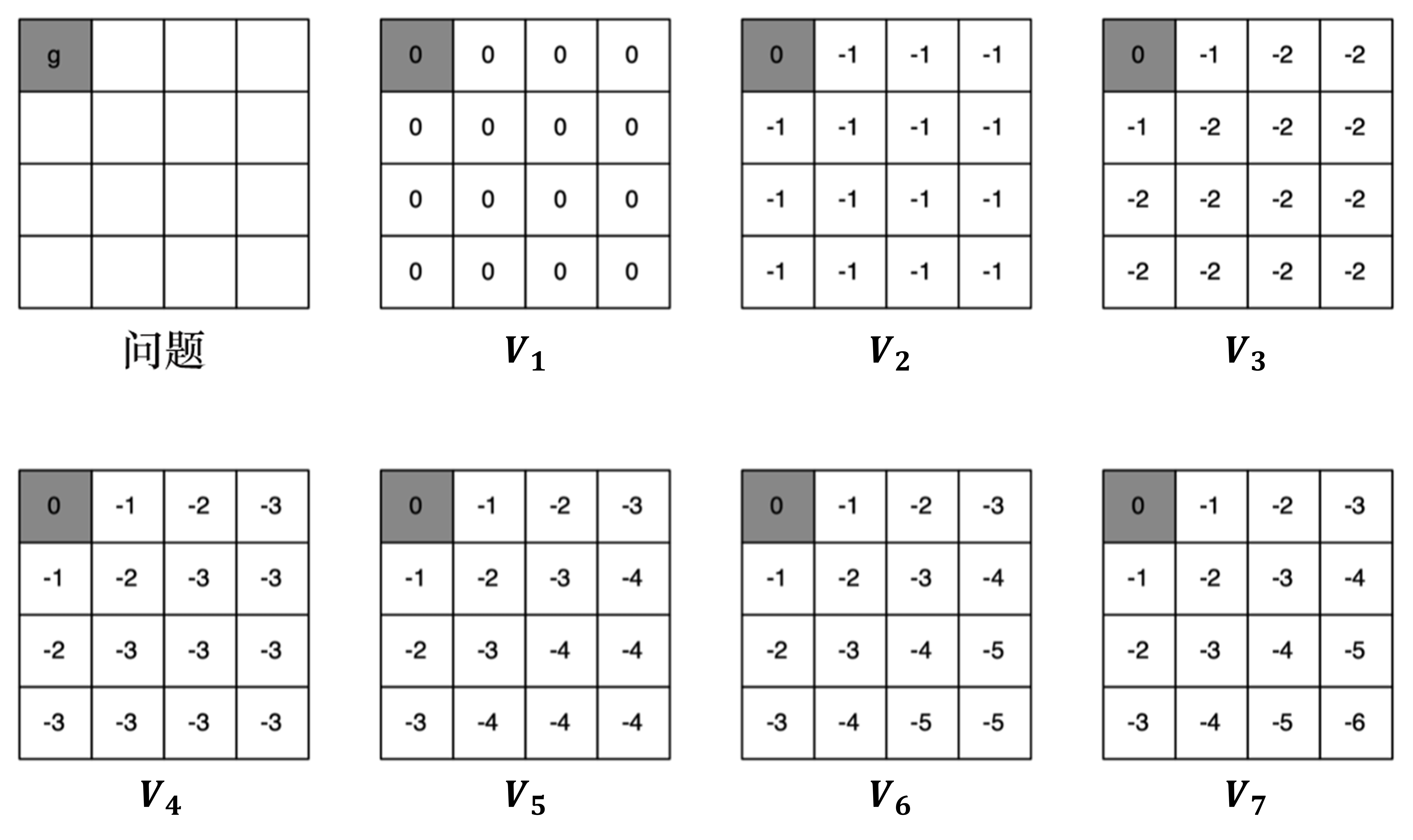 如图 2.23 所示,实际上,对于每一个状态,我们都可以将其看成一个终点。迭代由每一个终点开始,我们每次都根据贝尔曼最优方程重新计算价值。如果它的相邻节点价值发生了变化,变得更好了,那么它的价值也会变得更好,一直到相邻节点都不变。因此,在我们迭代到 $V_7$ 之前,也就是还没将每个终点的最优的价值传递给其他的所有状态之前,中间的几个价值只是一种暂存的不完整的数据,它不能代表每一个状态的价值,所以生成的策略是没有意义的策略。价值迭代是一个迭代过程,图 2.23 可视化了从 $V_1$ 到 $V_7$ 每一个状态的价值的变化。而且因为智能体每走一步就会得到一个负的价值,所以它需要尽快地到达终点,可以发现离它越远的状态,价值就越小。$V_7$ 收敛过后,右下角的价值是 $-$6,相当于它要走6步,才能到达终点。智能体离终点越近,价值越大。当我们得到最优价值后,我们就可以通过策略提取来得到最佳策略。