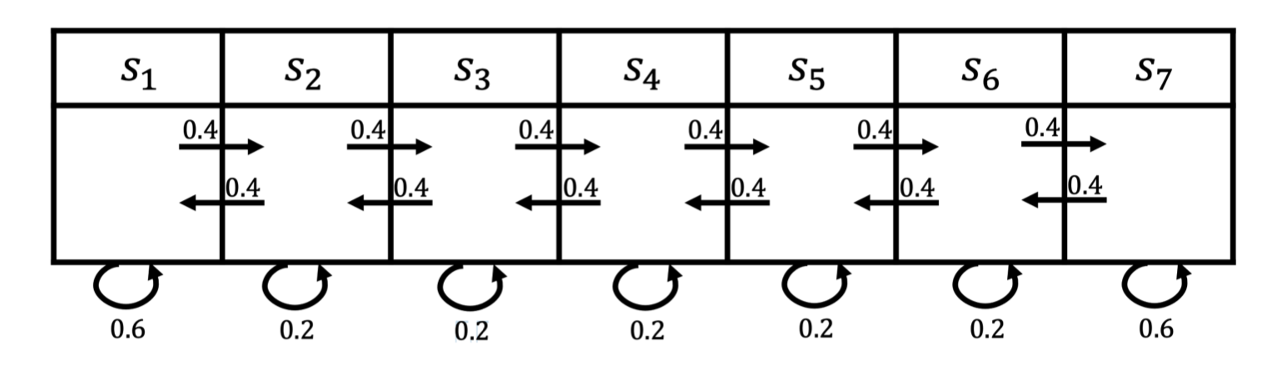 图 2.2 所示为一个马尔可夫过程的例子,这里有七个状态。比如从 $s_1$ 开始,它有0.4的概率到 $s_2$ ,有 0.6 的概率留在当前的状态。 $s_2$ 有 0.4 的概率到$s_1$,有 0.4 的概率到 $s_3$ ,另外有 0.2 的概率留在当前状态。所以给定状态转移的马尔可夫链后,我们可以对这个链进行采样,这样就会得到一串轨迹。例如,假设我们从状态 $s_3$ 开始,可以得到3个轨迹: