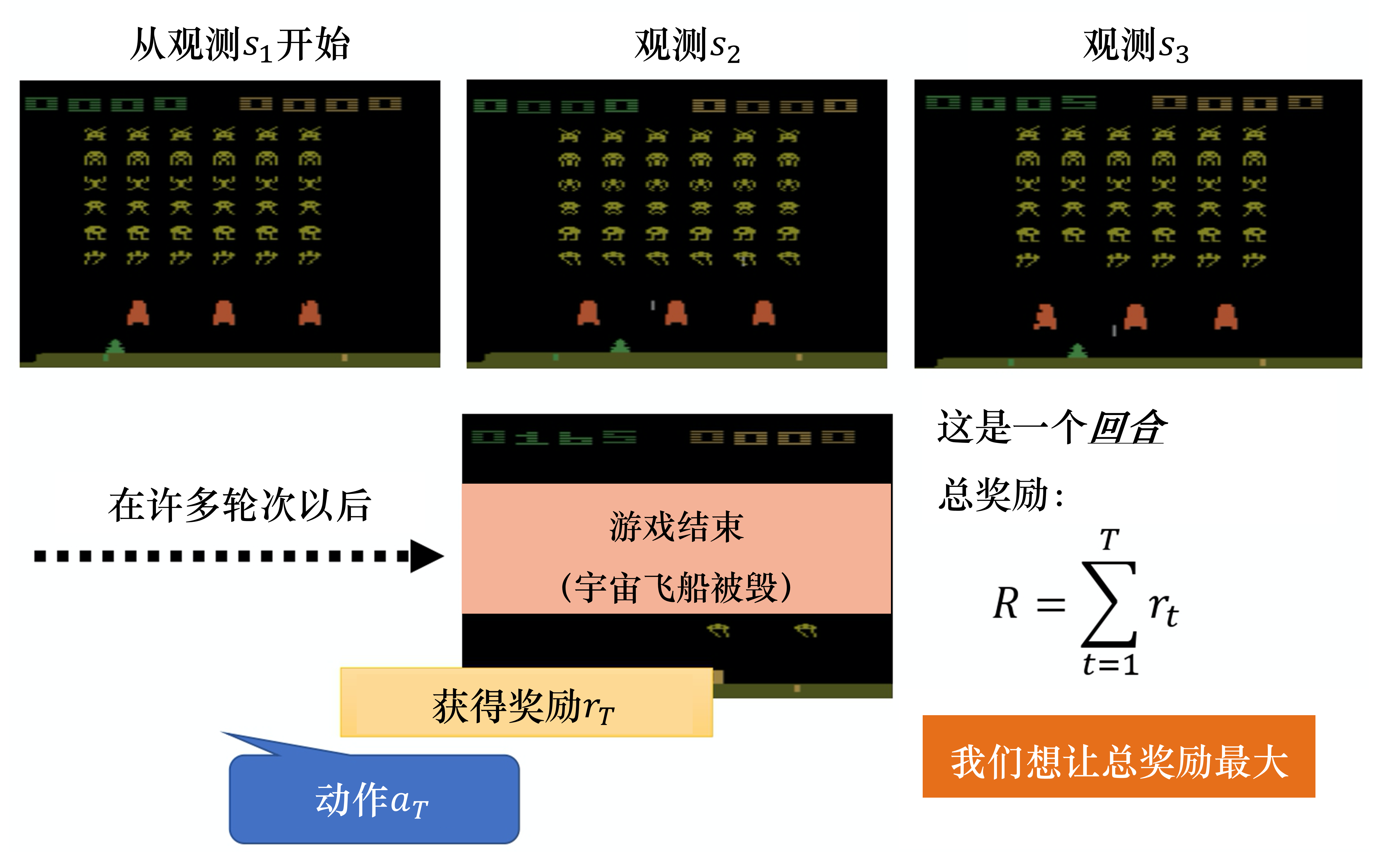 如图 4.4 所示,一场游戏称为一个回合。将这场游戏里面得到的所有奖励都加起来,就是**总奖励(total reward)**,也就是**回报**,我们用$R$来表示它。演员要想办法来最大化它可以得到的奖励。