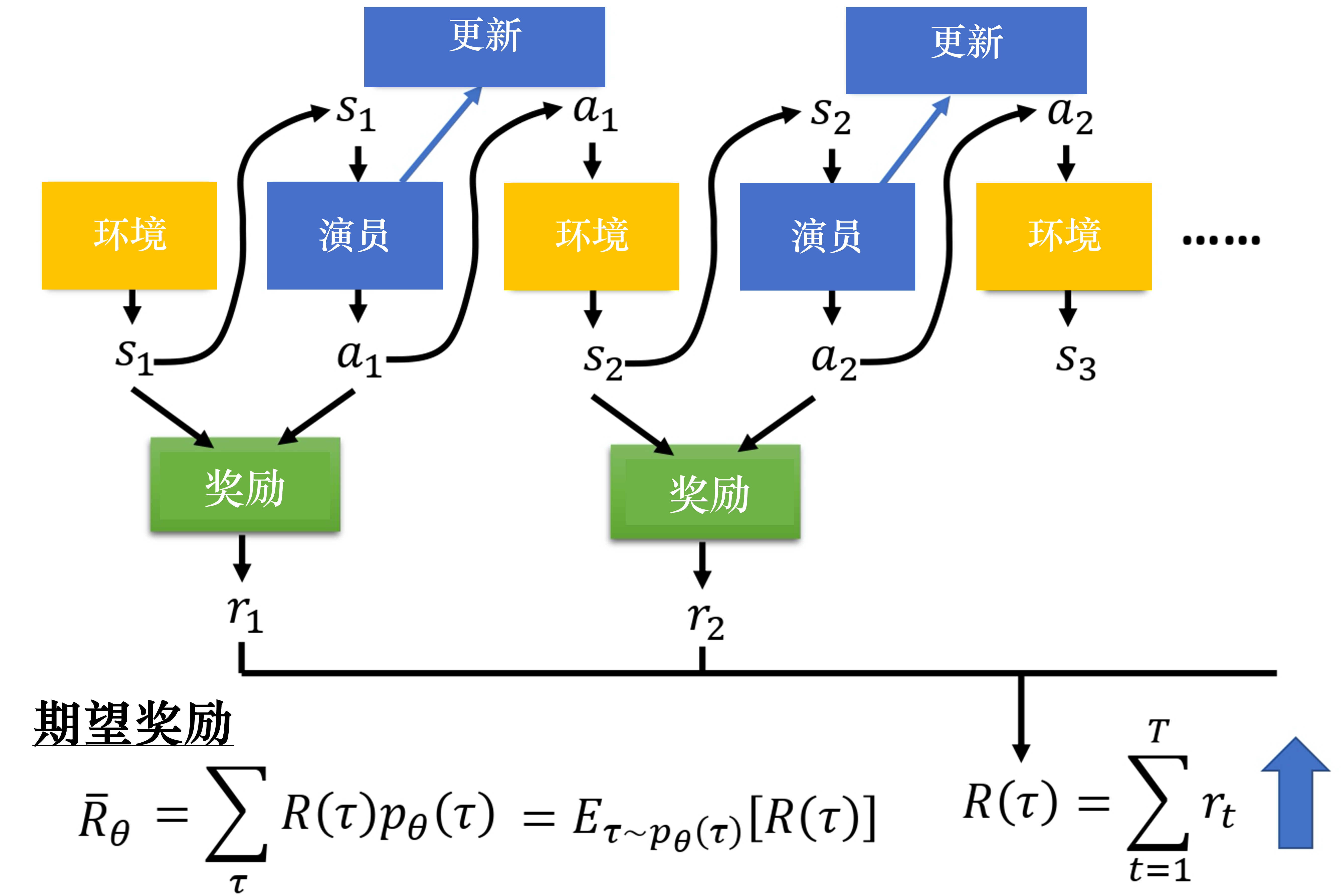 从分布 $p_{\theta}(\tau)$ 采样一个轨迹 $\tau$,计算 $R(\tau)$ 的期望值,就是期望奖励(expected reward)。我们要最大化期望奖励。