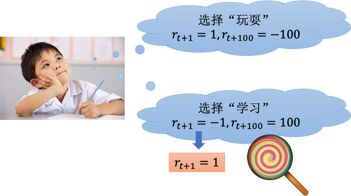 例如,如图 10.1 所示,如果我们把小孩当成一个智能体,他可以采取两个动作:玩耍或者学习。如果他玩耍,在下一个时间点就会得到奖励 1。但是他在月考的时候成绩可能会很差所以在 100 个小时之后,他会得到奖励 $-$100。他也可以决定要学习在下一个时间点因为他没有玩耍所以觉得很不爽所以得到奖励 $-$1。但是在 100 个小时后,他可以得到奖励 100。对于一个小孩来说他可能就会想要采取玩耍的动作而不是学习的动作。我们计算的是累积奖励但也许对小孩来说折扣因子会很大所以他就不太在意未来的奖励。而且因为他是一个小孩还没有很多经验所以他的Q函数估计是非常不精准的。所以要他去估计很远以后会得到的累积奖励他是估计不出来的。这时候大人就要引导他对他说“如果你学习我就给你一根棒棒糖。”对小孩来说下一个时间点他得到的奖励就变成正的他也许就会认为学习是比玩耍好的。虽然这并不是真正的奖励而是其他人引导他的奖励。设计奖励的概念是一样的简单来说就是我们自己想办法设计一些奖励这些奖励不是环境真正的奖励。在玩雅达利游戏时真正的奖励是游戏主机给的奖励但我们自己可以设计一些奖励引导智能体让智能体做我们想要它做的事情。