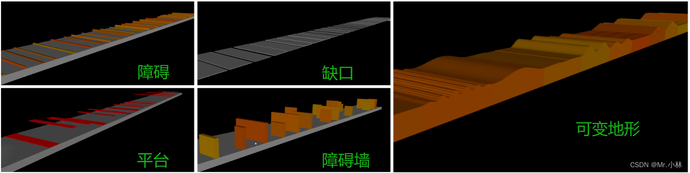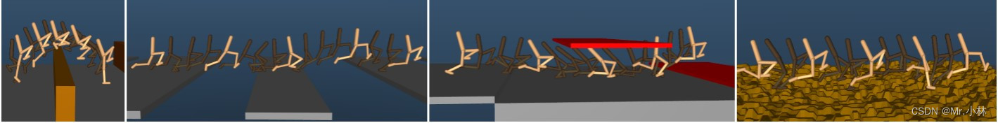 - 第二种是 障碍的难度由最小和最大高度决定,随着智能体的学习来通过课程的方式增加障碍难度的地形。