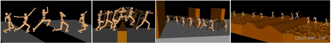 为了让智能体面临各种各样的运动挑战,使用类似于平台游戏的物理模拟环境并利用 Mujoco物理引擎 实现。会程序化的生成大量具有各种障碍物的不同地形;并且每个回合生成的地形和障碍物实例都不同。