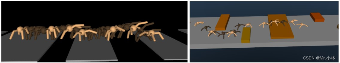 为了证明 在环境的地形上 设置让障碍的难度由浅到深难度逐渐增加,实验设置通过两种不同类型的障碍地形进行对比: