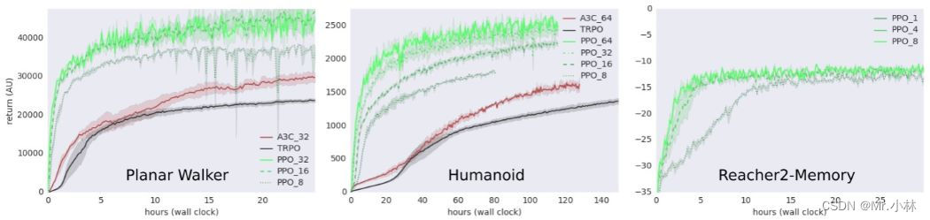 由上图可以看出,DPPO算法 能够在性能上与TRPO算法相似,并随着 线程 的拓展,可以明显 减少训练的收敛时间 和 获得更高的 回报值。且因为PPO算法是基于策略梯度算法的,可以直接使用循环神经网络(RNN)来拟合策略函数,在需要记忆的记忆机械臂任务环境中也能适用。