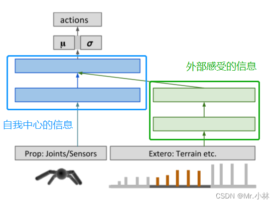 在构建参数化策略函数上,目标是深度神经网络能够对 来自本体的特征(基本的运动技能)与 来自环境的外部特征(地形感知和方向导航)进行关注点的分离。将策略构建为两个子网络,其中一个仅接收来自本体的特征,另一个仅来自环境的外部特征。
