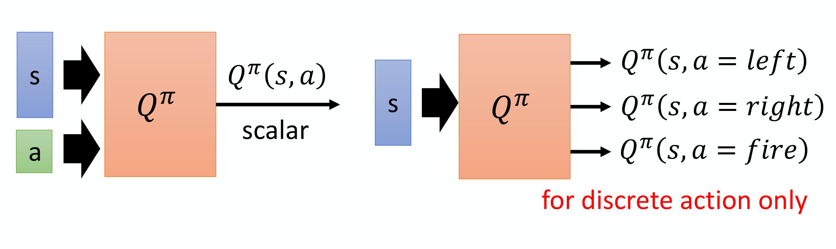 假设动作是离散的,动作就只有 3 个可能:往左往右或是开火。那这个 Q-function 输出的 3 个值就分别代表 a 是向左的时候的 Q 值,a 是向右的时候的 Q 值,还有 a 是开火的时候的 Q 值。