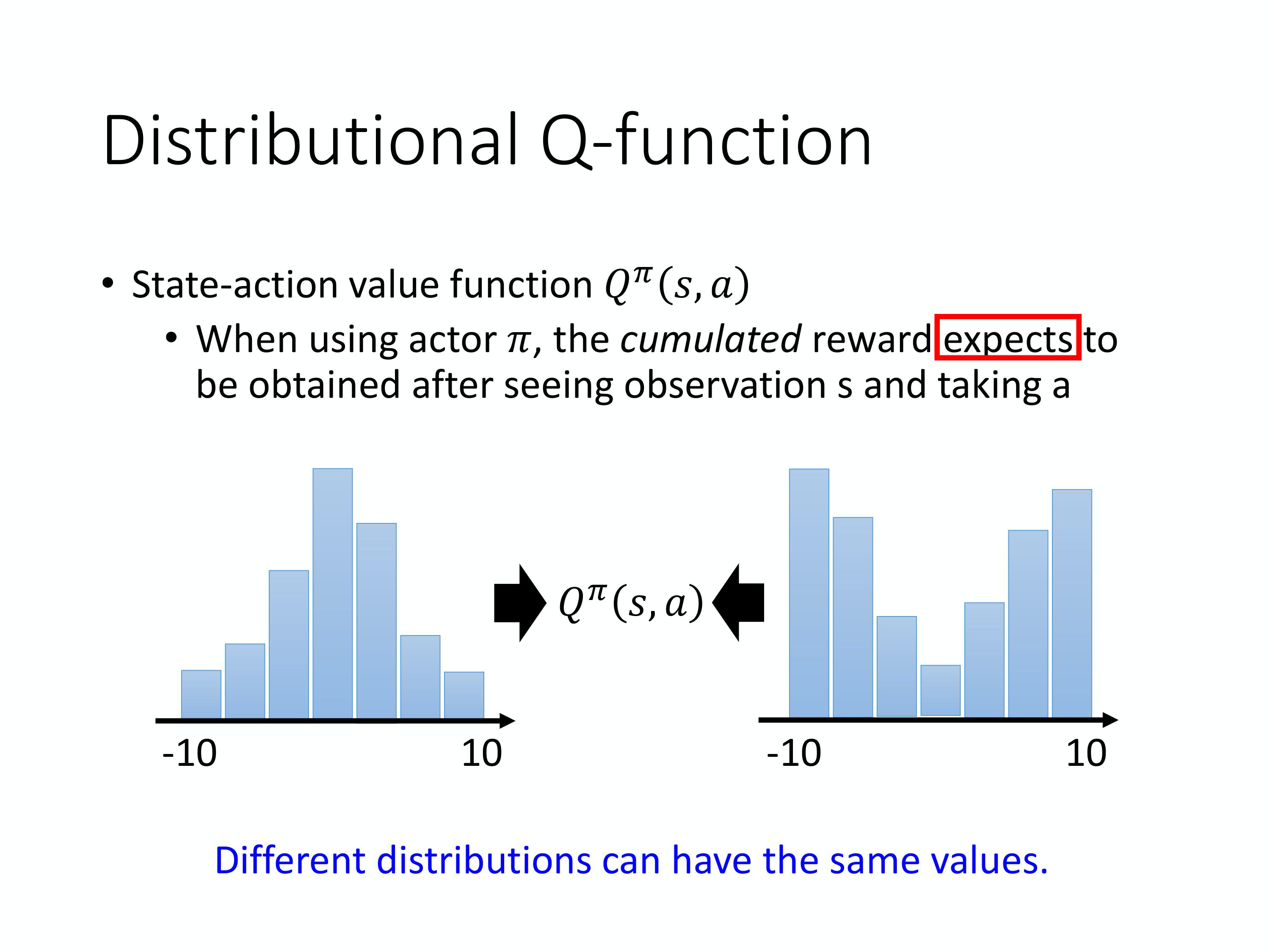 还有一个技巧叫做 Distributional Q-function。我们不讲它的细节只告诉你大致的概念。Distributional Q-function 还蛮有道理的, 但是它没有红起来。你就发现说没有太多人真的在实现的时候用这个技术可能一个原因就是它不好实现。它的意思是什么Q-function 到底是什么意思啊Q-function 是 accumulated reward 的期望值所以我们算出来的这个Q value 其实是一个期望值。因为环境是有随机性的在某一个state 采取某一个action 的时候我们把所有的reward 玩到游戏结束的时候所有的 reward 进行一个统计你其实得到的是一个distribution。也许在reward 得到0 的机率很高,在-10 的概率比较低,在+10 的概率比较低但是它是一个distribution。我们对这一个distribution 算它的mean才是这个Q value我们算出来是 expected accumulated reward。所以这accumulated reward 是一个distribution对它取expectation对它取mean你得到了Q value。但不同的distribution它们其实可以有同样的mean。也许真正的distribution 是右边的distribution它算出来的 mean 跟左边的 distribution 算出来的mean 其实是一样的但它们背后所代表的distribution 其实是不一样的。假设我们只用一个 expected 的 Q value 来代表整个reward 的话,其实可能会丢失一些 information你没有办法 model reward 的distribution。