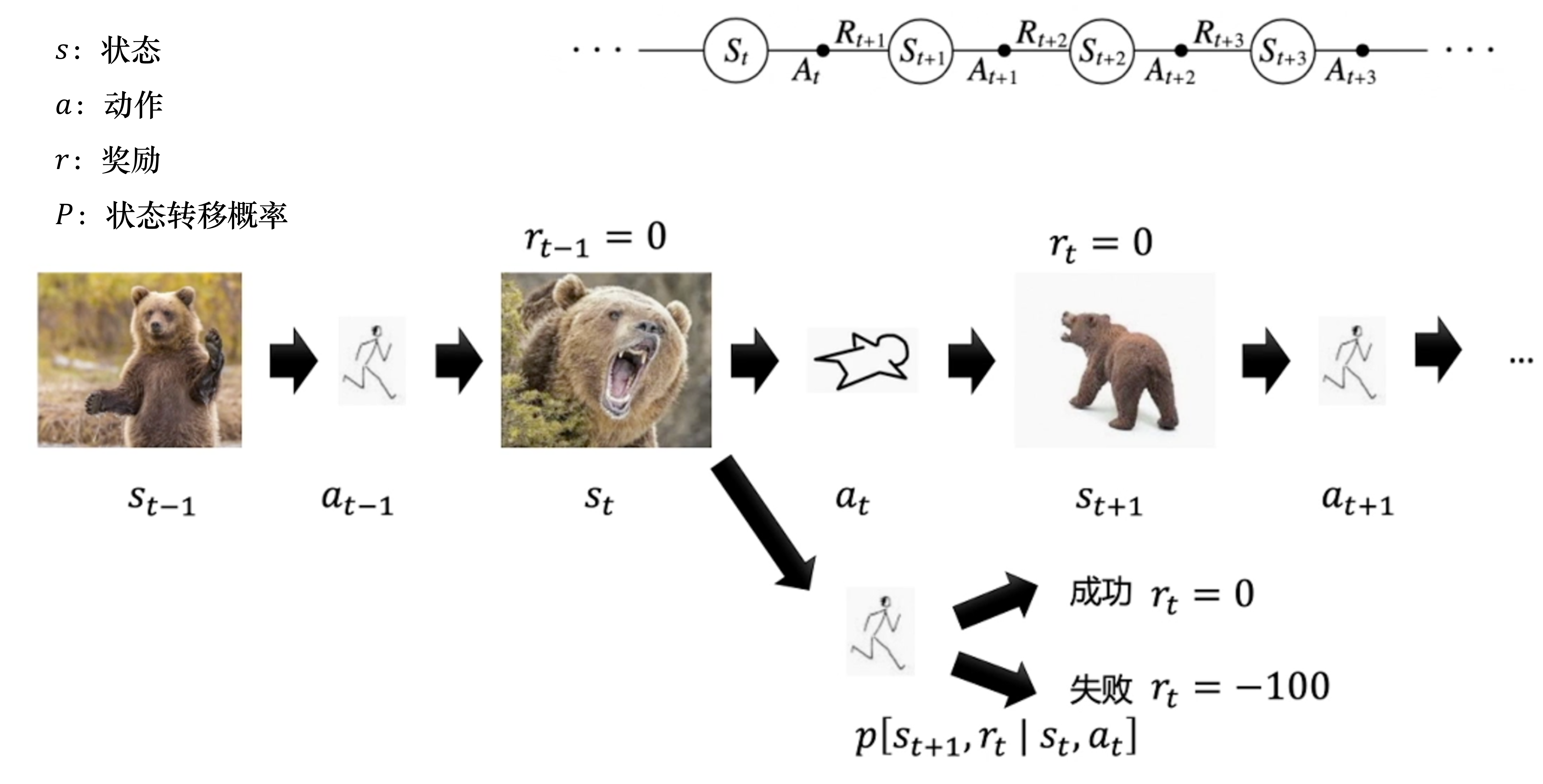 在输出每一个动作之前,我们可以选择不同的动作。比如在 t 时刻,我选择逃跑的时候,可能熊已经追上来了。如果在 t 时刻,我没有选择装死,而是选择逃跑,这个时候熊已经追上来了,那么我就会转移到不同的状态。有一定的概率我会逃跑成功,也有一定的概率我会逃跑失败。我们用状态转移概率 p\left[s_{t+1}, r_{t} \mid s_{t}, a_{t}\right] 来表示在状态 s_t 选择动作 a_t 的时候,转移到转态 s_{t+1} ,而且得到奖励 r_t 的概率是多少。状态转移概率是具有马尔可夫性质的(系统下一时刻的状态仅由当前时刻的状态决定,不依赖于以往任何状态)。因为在这个过程中,下一时刻的状态取决于当前的状态 $s_t$,它和之前的 s_{t-1}s_{t-2} 没有关系。再加上这个过程也取决于智能体与环境交互的 a_t ,所以包含了决策的过程,我们称这样的过程为马尔可夫决策过程。马尔可夫决策过程就是序列决策的经典的表现方式。马尔可夫决策过程也是强化学习里面一个非常基本的学习框架。状态、动作、状态转移概率和奖励 $(S$、$A$、$P$、$R)$这4个合集就构成了强化学习马尔可夫决策过程的四元组后面也可能会再加上折扣因子构成五元组。