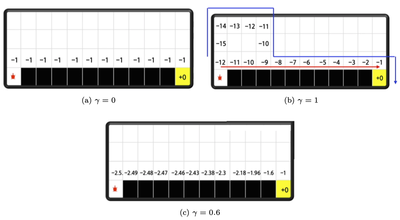 • 如果 $\gamma = 0$,如图 3.10a 所示,我们考虑的就是单步的奖励,我们可以认为它是目光短浅的计算的方法。
