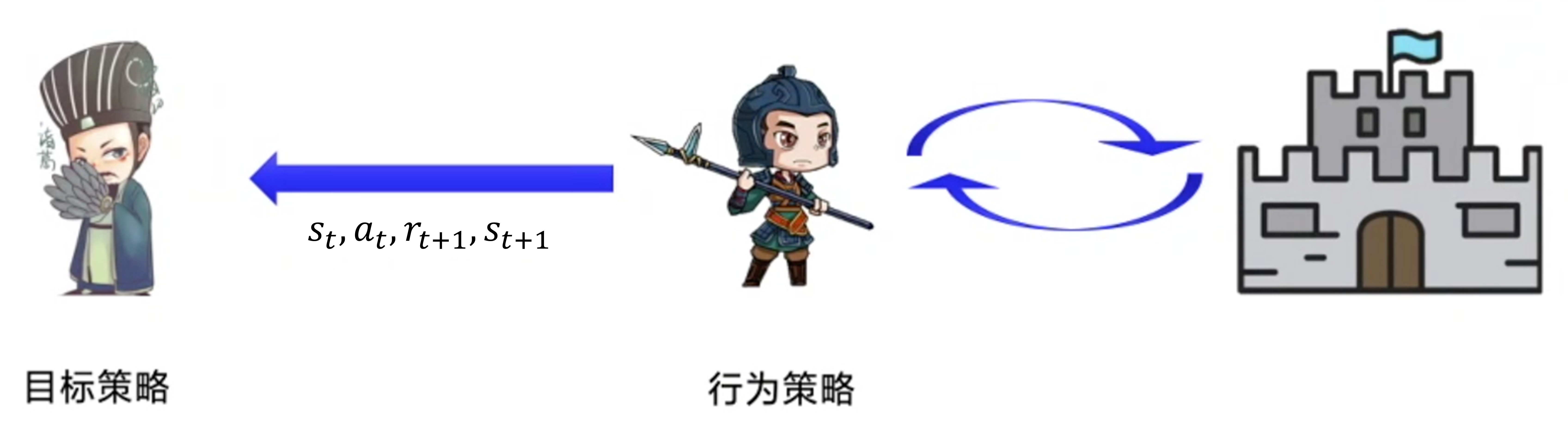 再例如,如图 3.32 所示比如环境是波涛汹涌的大海但学习策略learning policy太“胆小”了无法直接与环境交互学习所以我们有了探索策略exploratory policy探索策略是一个不畏风浪的海盗它非常激进可以在环境中探索。因此探索策略有很多经验它可以把这些经验“写成稿子”然后“喂”给学习策略。学习策略可以通过稿子进行学习。
