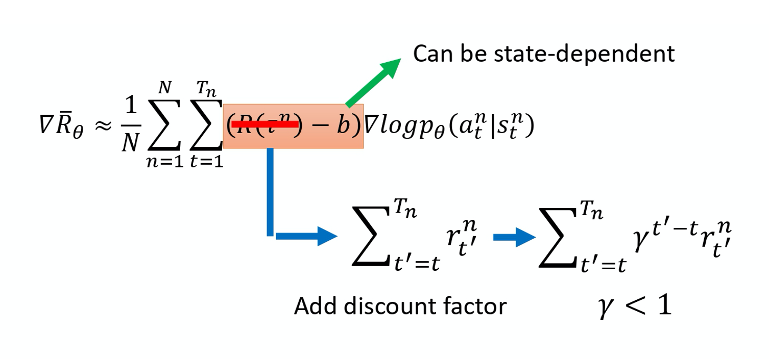 我们原来会做的事情是,在某一个 state假设你执行了某一个 action a它得到的 reward ,它前面乘上的这一项 $R(\tau^n)-b$。