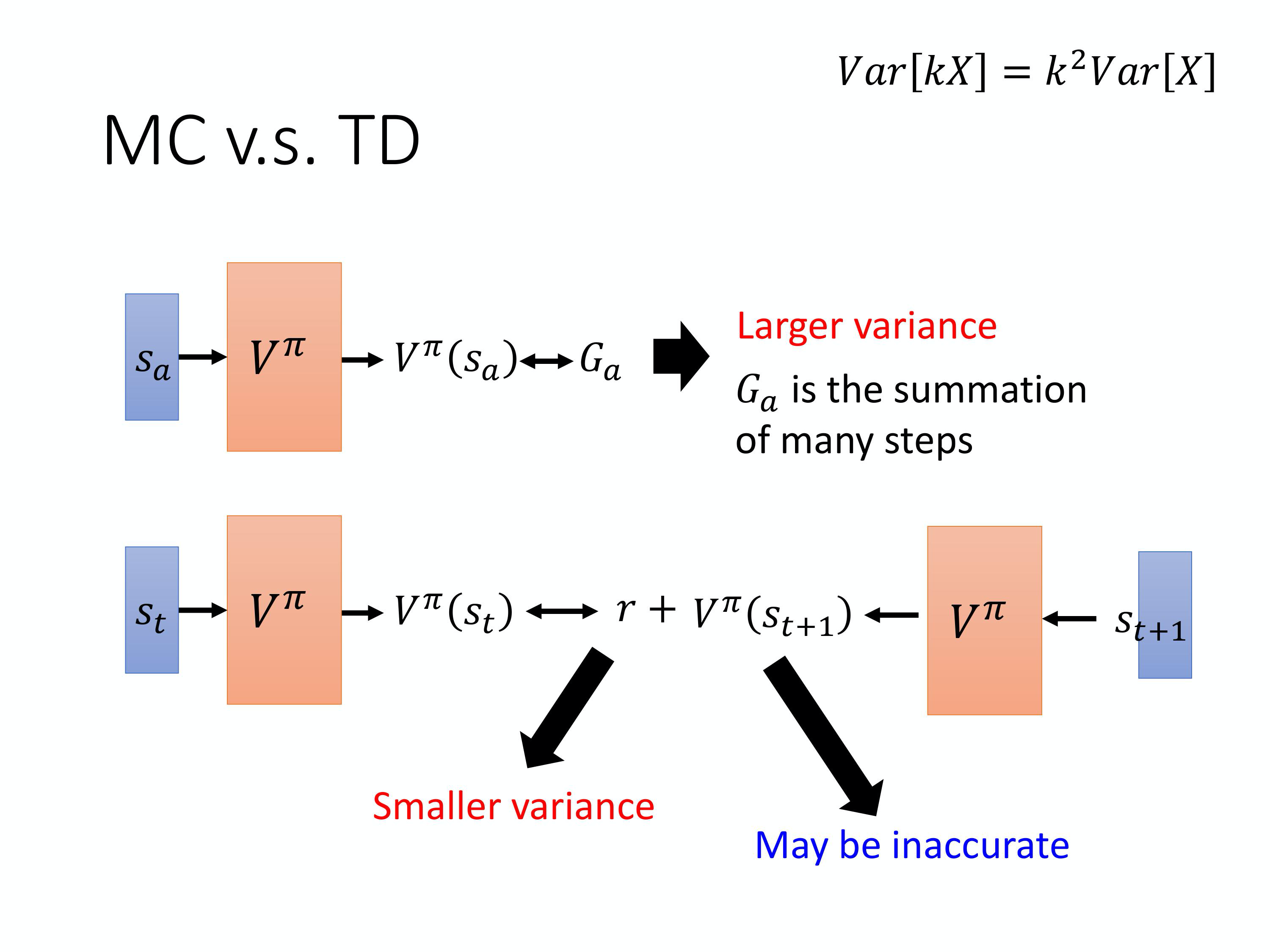 MC 跟TD 有什么样的差别呢MC 最大的问题就是 variance 很大。因为我们在玩游戏的时候,它本身是有随机性的。所以你可以把 G_a 看成一个 random 的 variable。因为你每次同样走到 s_a 的时候,最后你得到的 G_a 其实是不一样的。你看到同样的state $s_a$最后玩到游戏结束的时候因为游戏本身是有随机性的你的玩游戏的model 本身搞不好也有随机性,所以你每次得到的 G_a 是不一样的,每一次得到G_a 的差别其实会很大。为什么它会很大呢?因为 G_a 其实是很多个不同的 step 的reward 的和。假设你每一个step 都会得到一个rewardG_a 是从 state s_a 开始一直玩到游戏结束每一个timestamp reward 的和。