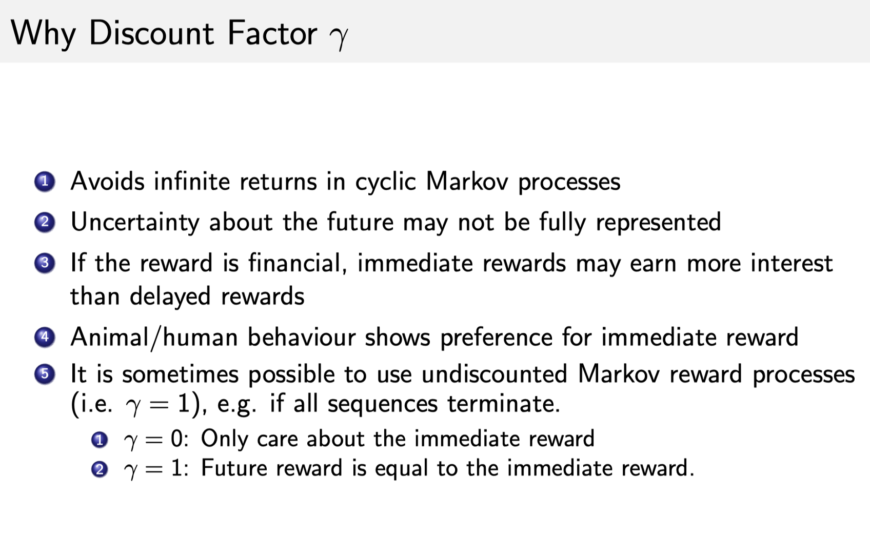 - 第一点是有些马尔可夫过程是带环的,它并没有终结,我们想避免这个无穷的奖励。
