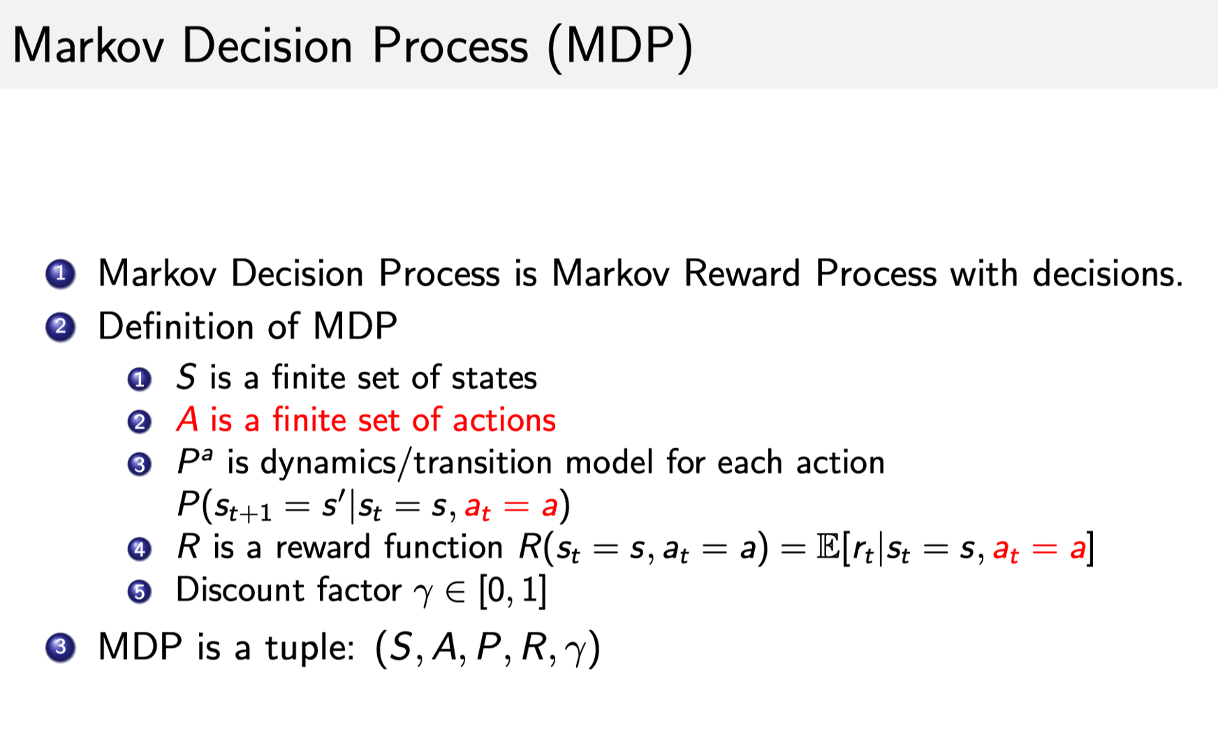 相对于 MRP,马尔可夫决策过程(Markov Decision Process)多了一个 decision,其它的定义跟 MRP 都是类似的。这里我们多了一个决策,多了一个 action ,那么这个状态转移也多了一个 condition,就是你采取某一种行为,然后你未来的状态会不同。它不仅是依赖于你当前的状态,也依赖于在当前状态你这个 agent 它采取的这个行为会决定它未来的这个状态走向。对于这个价值函数,它也是多了一个条件,多了一个你当前的这个行为,就是说你当前的状态以及你采取的行为会决定你在当前可能得到的奖励多少。