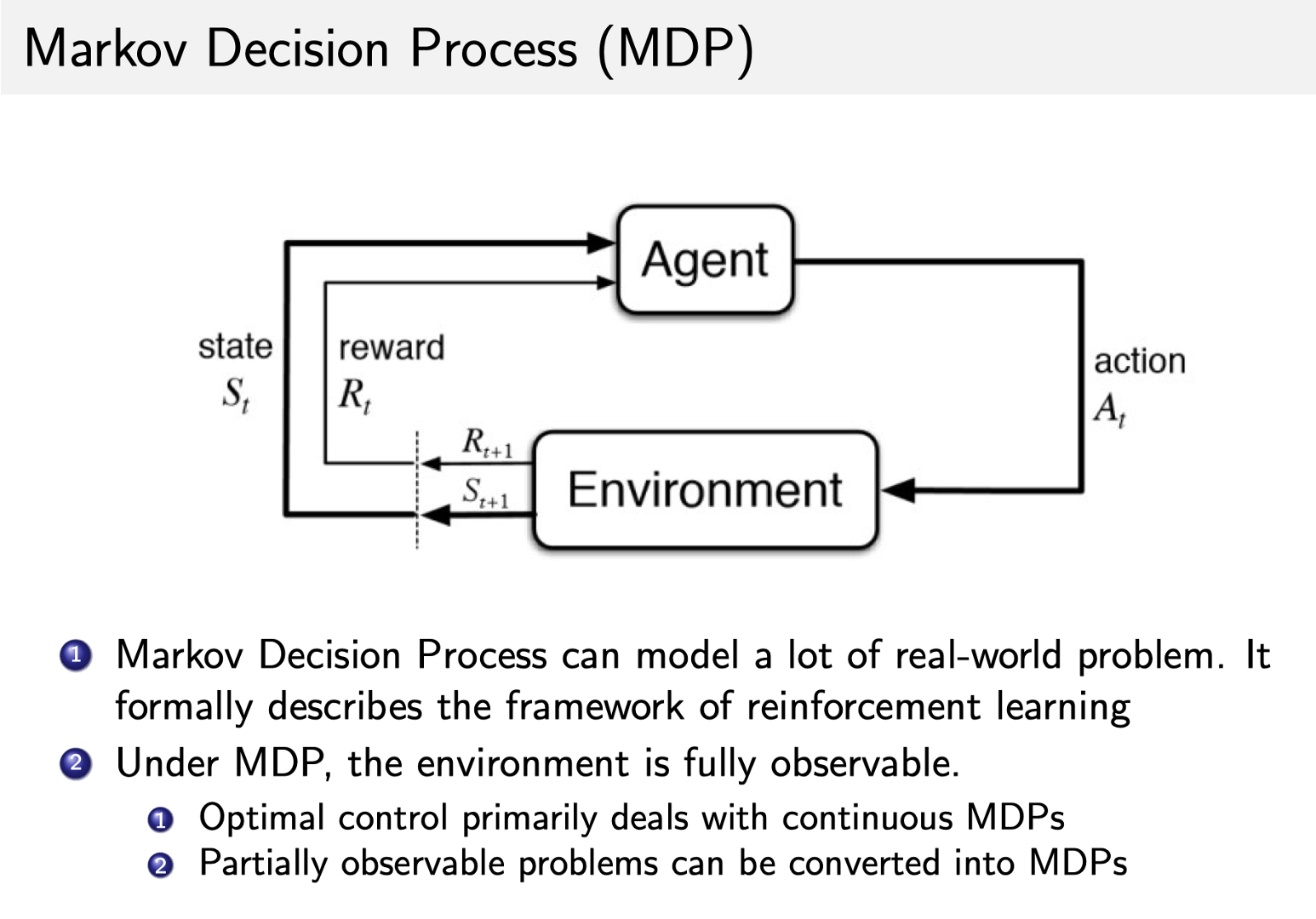 上图介绍了在强化学习里面 agent 跟 environment 之间的交互,agent 在得到环境的状态过后,它会采取行为,它会把这个采取的行为返还给环境。环境在得到 agent 的行为过后,它会进入下一个状态,把下一个状态传回 agent。在强化学习中,agent 跟环境就是这样进行交互的,这个交互过程是可以通过马尔可夫决策过程来表示的,所以马尔可夫决策过程是强化学习里面的一个基本框架。在马尔可夫决策过程中,它的环境是 fully observable ,就是全部可以观测的。但是很多时候环境里面有些量是不可观测的,但是这个部分观测的问题也可以转换成一个 MDP 的问题。