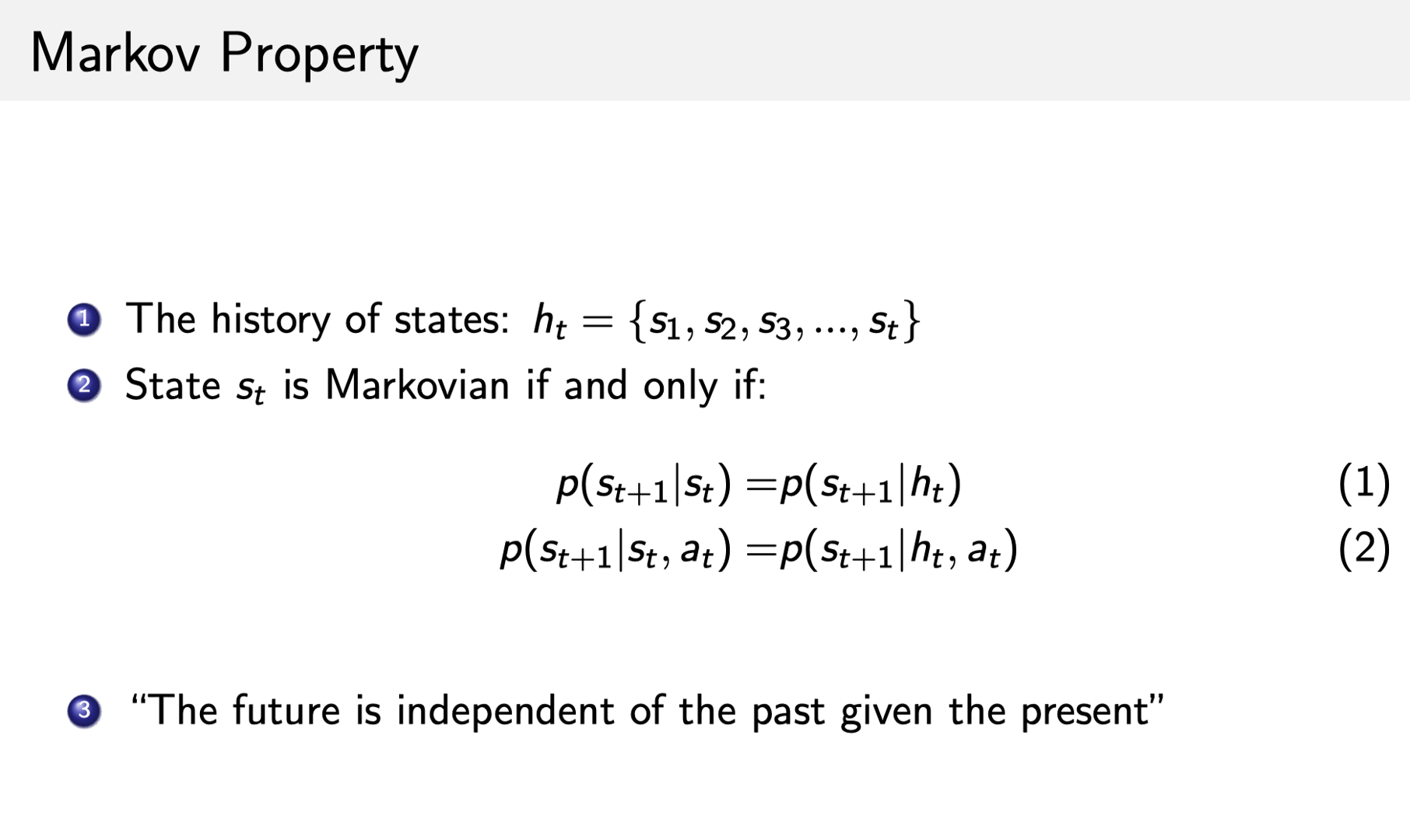 如果一个状态转移是符合马尔可夫的,那就是说一个状态的下一个状态只取决于它当前状态,而跟它当前状态之前的状态都没有关系。比如说我们这里有一个 $h_t$,它包含了之前的所有状态。但是这里的转移从当前 s_t 转到 s_{t+1} 这个状态,它是直接就等于它之前所有的状态。如果某一个过程满足马尔可夫性质(Markov Property),就是说未来的转移跟过去是独立的,它只取决于现在。马尔可夫性质是所有马尔可夫过程的基础。