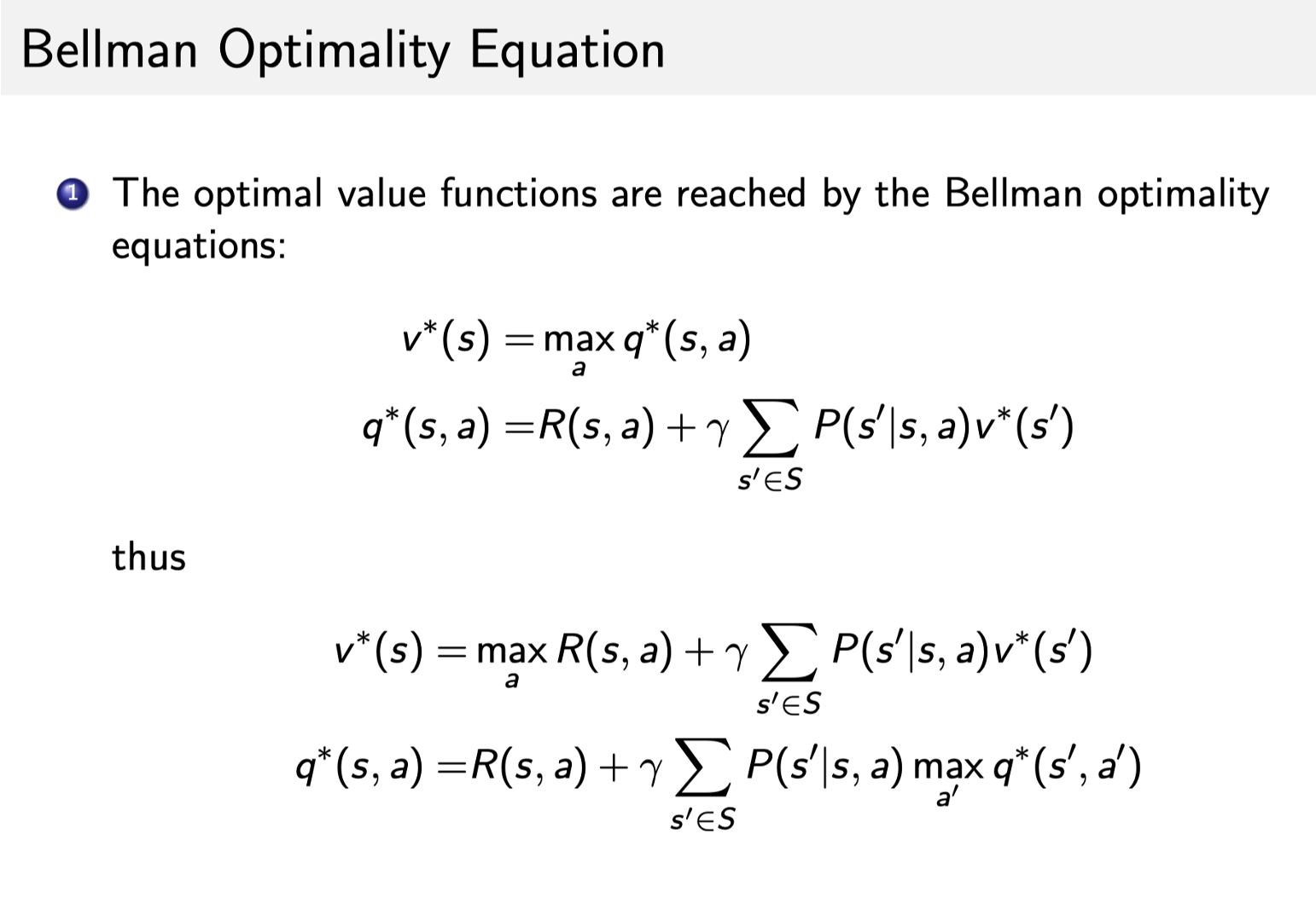 q^{*}(s, a)=R(s, a)+\gamma \sum_{s^{\prime} \in S} P\left(s^{\prime} \mid s, a\right) \max _{a^{\prime}} q^{*}\left(s^{\prime}, a^{\prime}\right)