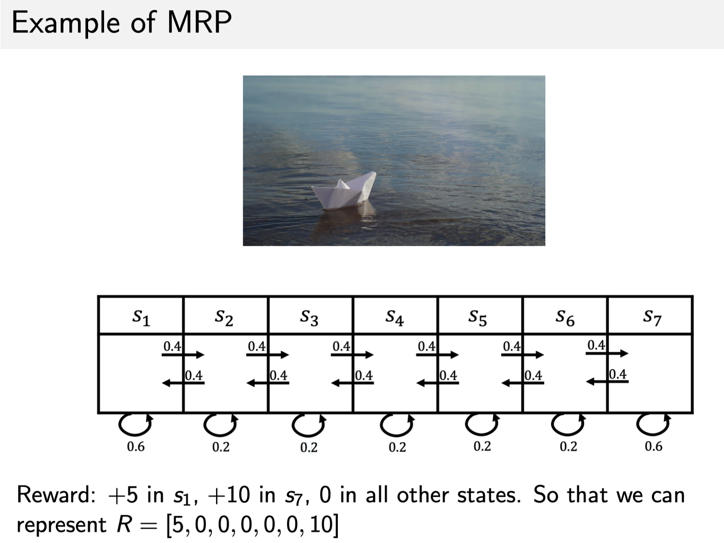 我们可以通过一个形象的例子来理解 MRP,你其实可以把它看成一个纸船,我们把一个纸船放到河流之中,那么它就会随着这个河流而流动,它自身是没有动力的,所以你可以把 MRP 看成是一个随波逐流的例子,当我们从某一个点开始的时候,这个纸船就会随着事先定义好的状态转移进行流动,它到达每个状态过后,我们就有可能获得一些奖励。