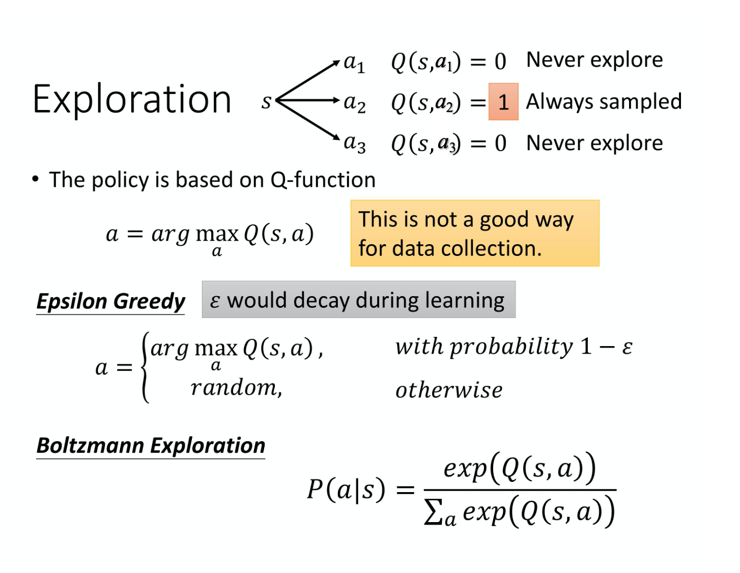 但是假设你在 state s你 sample 过某一个 action a_{2} ,它得到的值是 positive 的 reward。那 Q(s, a_2) 就会比其他的action 都要好。在采取 action 的时候, 就看说谁的 Q value 最大就采取谁,所以之后你永远都只会 sample 到 $a_{2}$,其他的 action 就再也不会被做了,所以就会有问题。就好像说你进去一个餐厅吃饭,其实你都很难选。你今天点了某一个东西以后,假说点了某一样东西, 比如说椒麻鸡,你觉得还可以。接下来你每次去就都会点椒麻鸡,再也不会点别的东西了,那你就不知道说别的东西是不是会比椒麻鸡好吃,这个是一样的问题。
