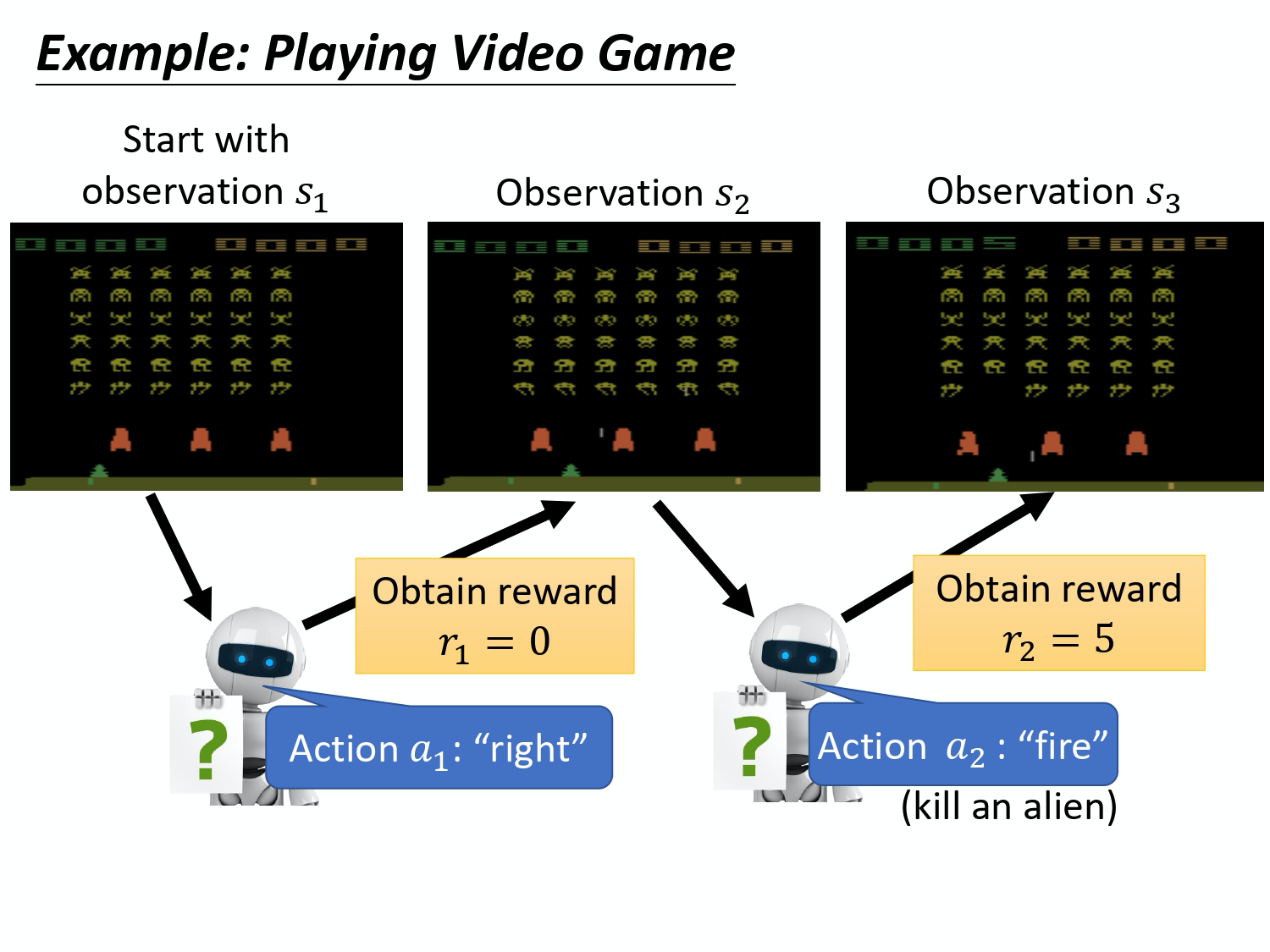 我们把一开始的初始画面记作 $s_1$, 把第一次执行的动作记作 $a_1$,把第一次执行动作完以后得到的奖励记作 $r_1$。不同的书会有不同的定义,有人会觉得说这边应该要叫做 $r_2$,这个都可以,你自己看得懂就好。演员决定一个行为以后,就会看到一个新的游戏画面,这边是 $s_2$。然后把这个 s_2 输入给演员,这个演员决定要开火,然后它可能杀了一只怪,就得到五分。这个过程就反复地持续下去,直到今天走到某一个时间点执行某一个动作,得到奖励之后,这个环境决定这个游戏结束了。比如说,如果在这个游戏里面,你是控制绿色的船去杀怪,如果你被杀死的话,游戏就结束,或是你把所有的怪都清空,游戏就结束了。