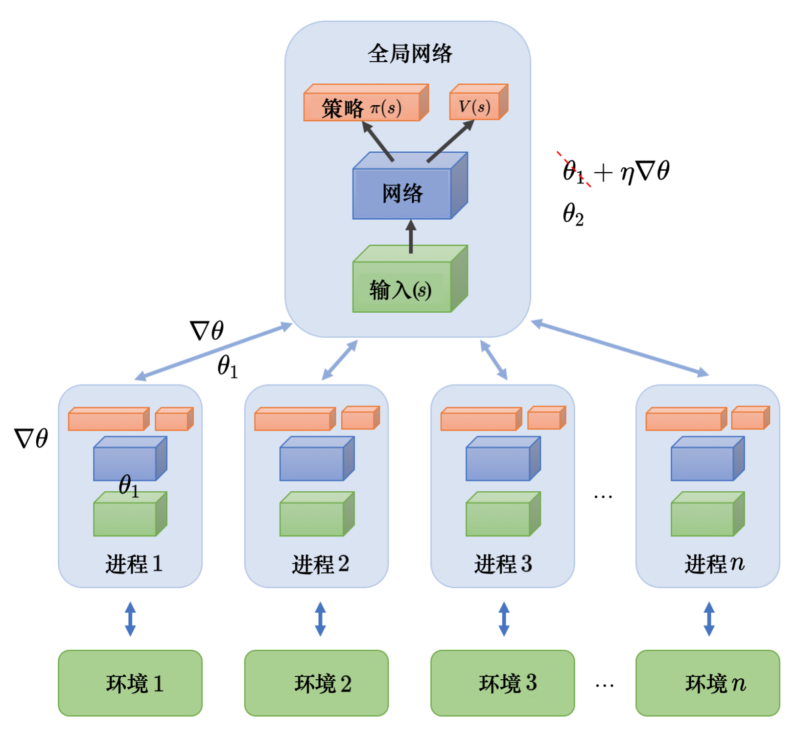 \theta_2了(其他进程也会更新模型) - 191页,图9.6的上面一段的末尾添加文字:虽然A3C看起来属于异策略算法,但它其实是一种同策略算法。因为A3C的演员和评论员只使用当前策略采样的数据来计算梯度。因此,A3C不存储历史数据,其主要通过平行探索(parallel exploration)来保持训练的稳定性。