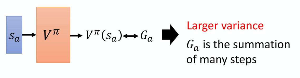 **MC 最大的问题就是方差很大。**因为我们在玩游戏的时候,它本身是有随机性的。所以你可以把 G_a 看成一个随机变量。因为你每次同样走到 s_a 的时候,最后你得到的 G_a 其实是不一样的。你看到同样的状态 $s_a$,最后玩到游戏结束的时候,因为游戏本身是有随机性的,玩游戏的模型搞不好也有随机性,所以你每次得到的 G_a 是不一样的,每一次得到 G_a 的差别其实会很大。为什么它会很大呢?因为 G_a 其实是很多个不同的步骤的奖励的和。假设你每一个步骤都会得到一个奖励,G_a 是从状态 s_a 开始,一直玩到游戏结束,每一个步骤的奖励的和。