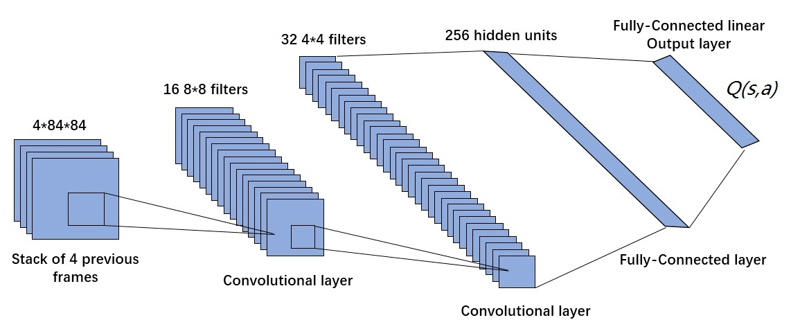DQN 使用深度卷积神经网络近似拟合状态动作值函数 $Q(s,a)$,其网络结构如上图所示。DQN 模型的输入是距离当前时刻最近的 4 帧图像,该输入经过 3 个卷积层和 2 个全连接层的非线性变化后,最终在输出层输出每个动作对应的 Q 值。