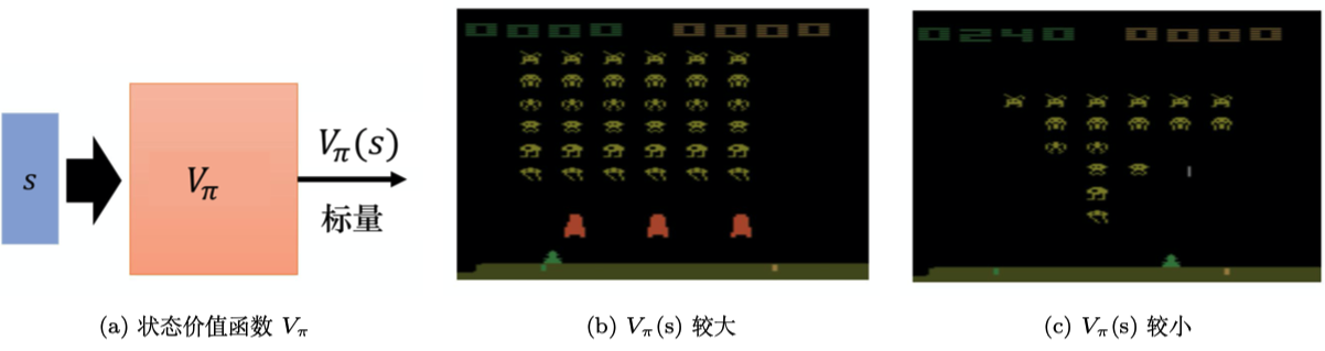 深度Q网络 是基于价值的算法,在基于价值的算法里面,我们学习的不是策略,而是评论员critic。评论员的任务是评价现在的动作有多好或有多不好。假设有一个演员,其要学习一个策略来得到尽量高的回报。评论员就是评价演员的策略 \pi 好还是不好,即策略评估。例如,有一种评论员称为状态价值函数$V_{\pi}$。状态价值函数是指,假设演员的策略是 $\pi$,用 \pi 与环境交互,假设 \pi 看到了某一个状态 $s$,例如在玩雅达利游戏,状态 s 是某一个画面,\pi 看到某一个画面,接下来一直到游戏结束,期望的累积奖励有多大。如图 6.1a 所示,V_{\pi} 是一个函数,输入一个状态,它会输出一个标量。这个标量代表演员的策略\pi 看到状态 s 的时候,预期到游戏结束的时候,它可以获得多大的奖励。例如,假设我们在玩太空侵略者,图 6.1b 所示的状态 $s$,这个游戏画面,V_{\pi}(s) 也许会很大,因为这时还有很多的怪兽可以击杀, 所以我们会得到很高的分数。一直到游戏结束的时候,我们仍然有很多的分数可以获得。图 6.1c 所示的情况我们得到的 V_{\pi}(s) 可能就很小,因为剩下的怪兽也不多,并且红色的防护罩已经消失了,所以我们可能很快就会“死掉”。因此接下来得到预期的奖励,就不会太大。