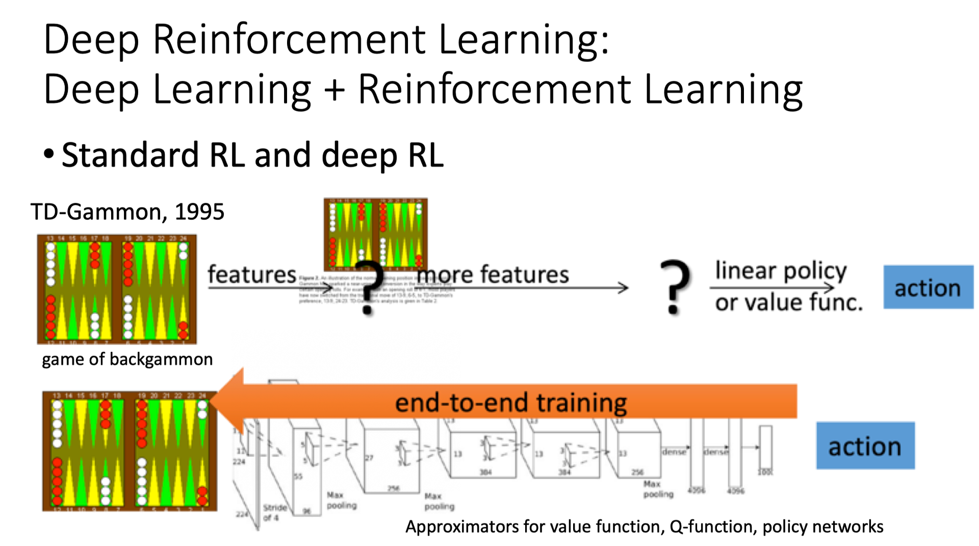 - 之前的强化学习,比如 TD-Gammon 玩 backgammon 这个游戏,它其实是设计特征,然后通过训练价值函数的一个过程,就是它先设计了很多手工的特征,这个手工特征可以描述现在整个状态。得到这些特征过后,它就可以通过训练一个分类网络或者分别训练一个价值估计函数来做出决策。