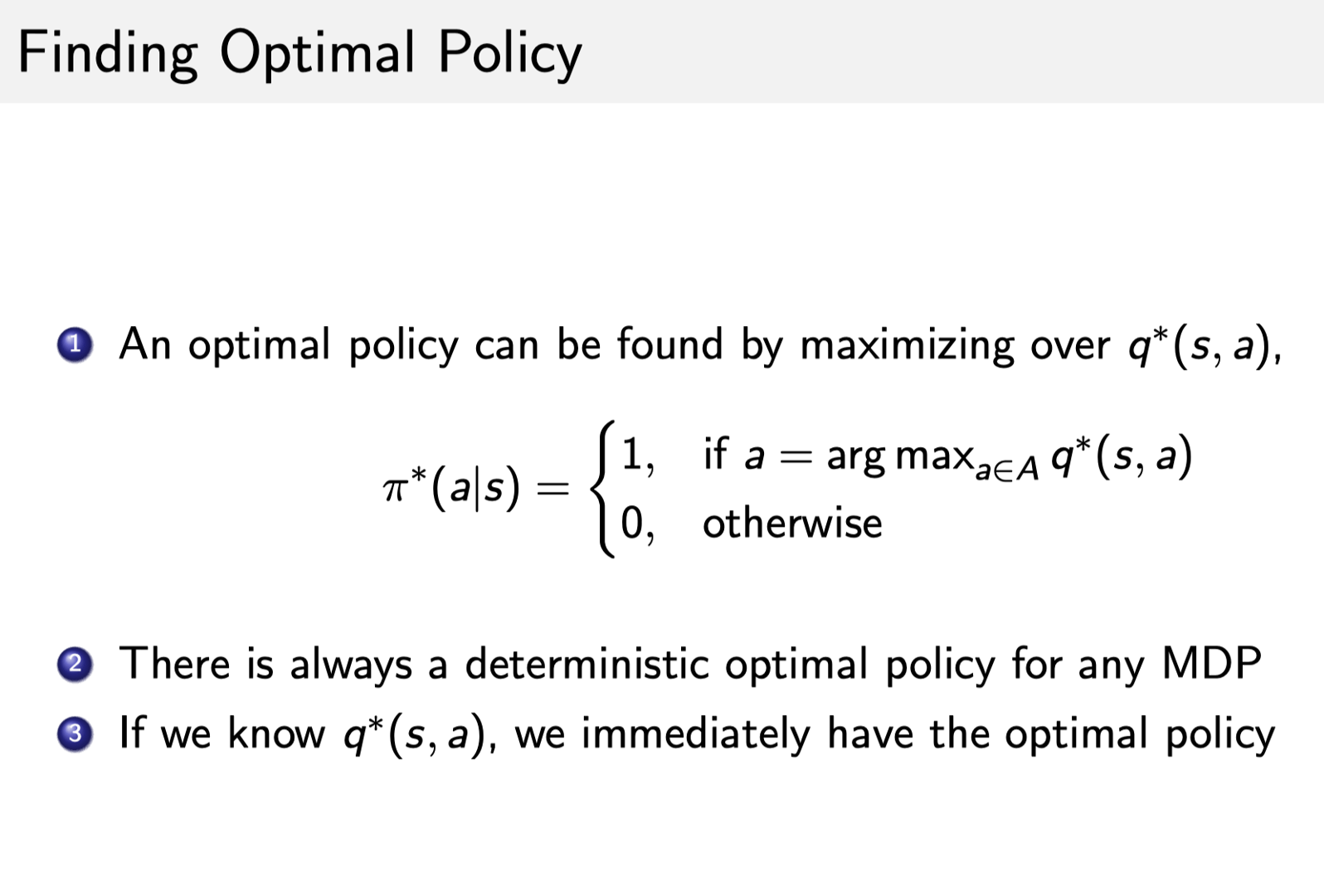 怎么去寻找这个最佳的 policy ,这里一个隐含条件是当我们取得最佳的价值函数过后,我们其实可以通过对这个 Q 函数进行极大化,然后得到最佳的价值。当所有东西都收敛过后,因为 Q 函数是关于状态跟动作的一个函数,所以对某一个状态采取一个行为,然后可以使得这个 Q 函数最大化,那么就这个行为就应该是最佳的行为。所以当我们能优化出一个 Q 函数,我们可以直接在这个 Q 函数上面取一个让这个 action 最大化的值,然后我们就可以直接提取出它的最佳策略。