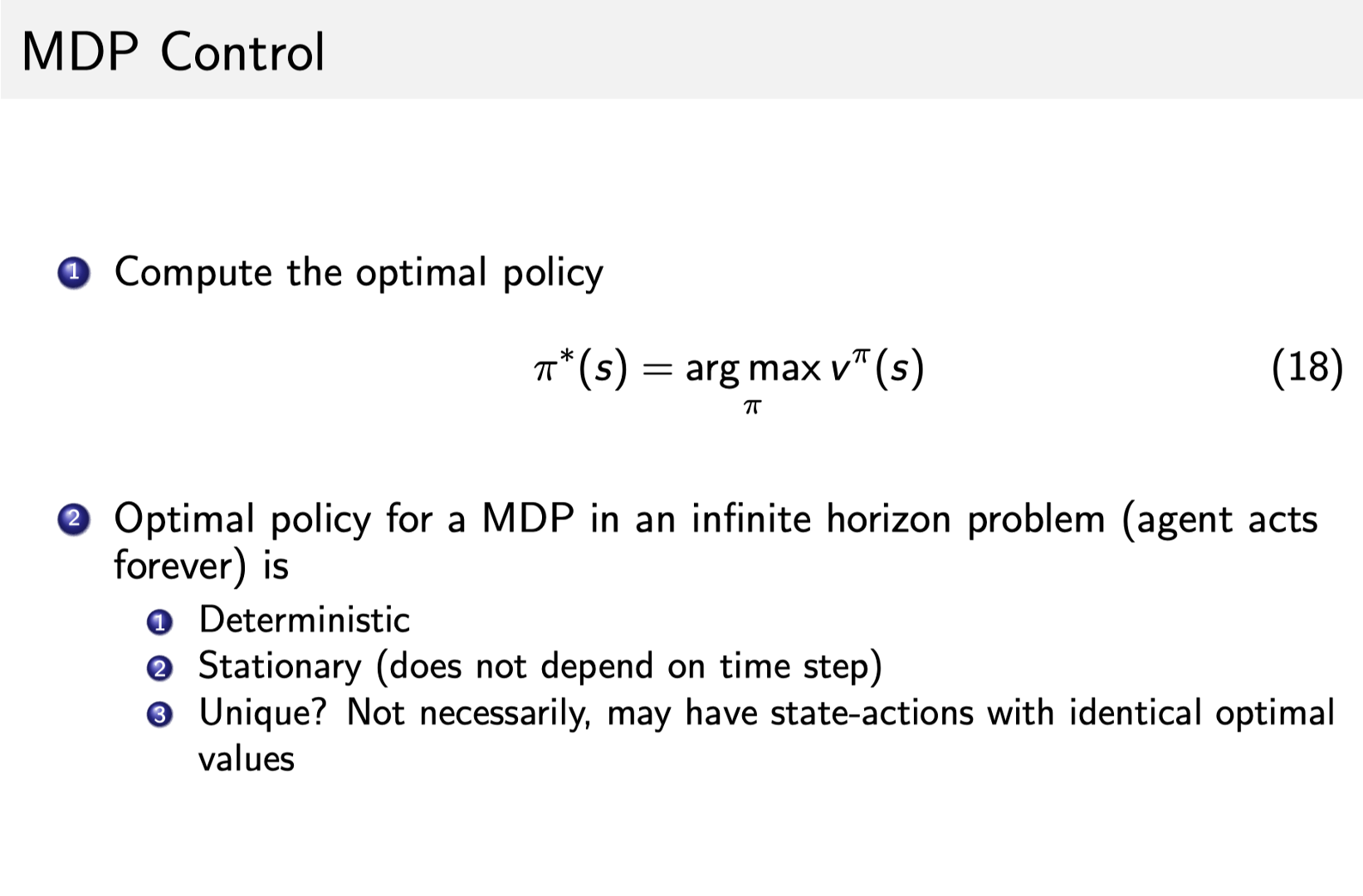所以我们在寻找这个最佳策略的过程就是 MDP 的控制过程,MDP Control 说的就是怎么去寻找一个最佳的策略,然后我们可以得到一个最大的价值函数。对于一个事先定好的 MDP 过程,当这个 agent 去采取策略的时候,我们可以说它这个最佳策略一般都是确定的。而且它是 stationary,它不会随着时间的变化。但是不一定是 unique,多种行为然后都会取得相同的这个这个价值。