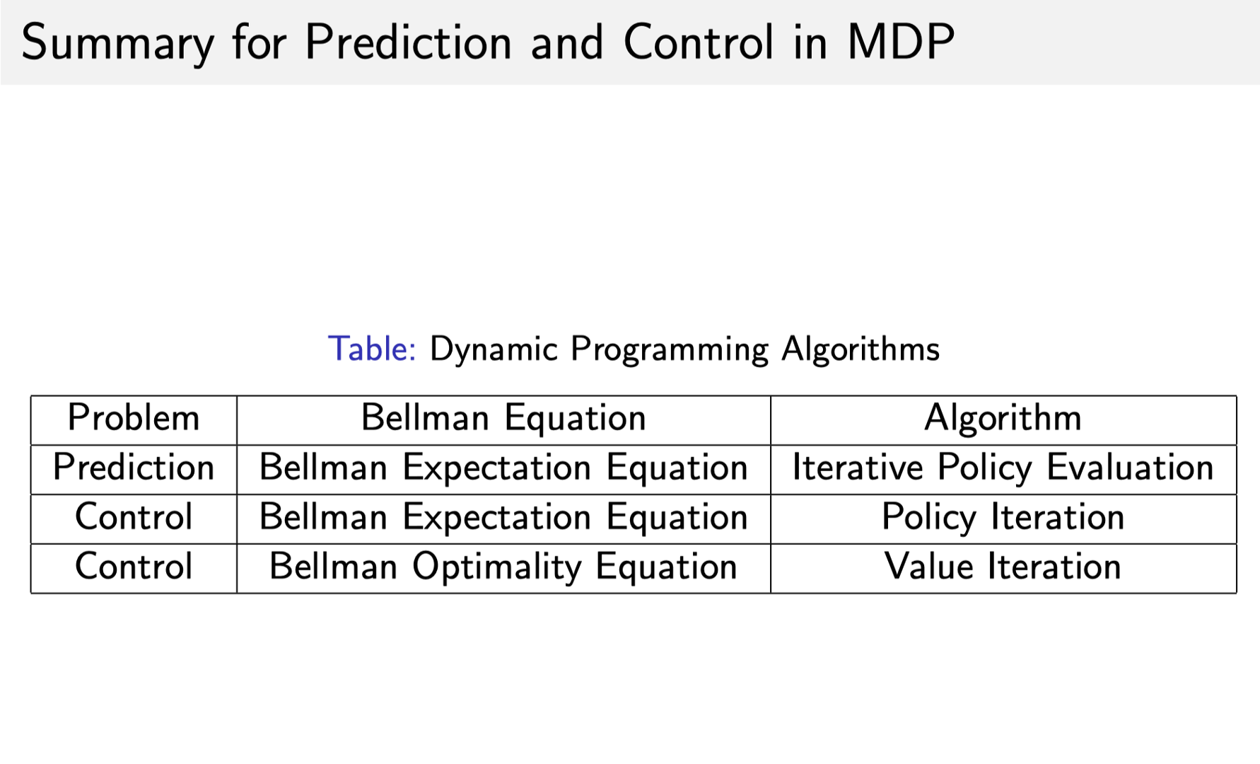 这里是一个总结,就对于 MDP 里面的 prediction 和 control 都是用动态规划来讲,我们其实采取了不同的 Bellman Equation。