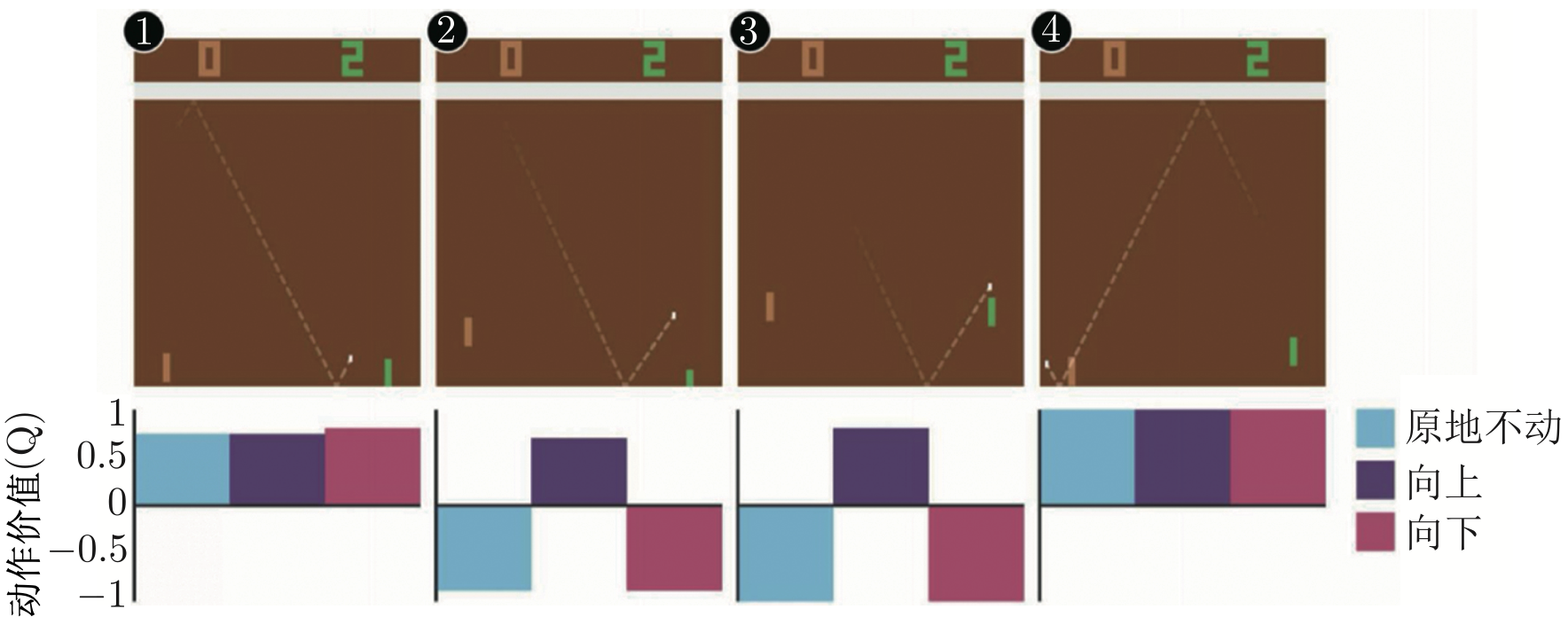 如果我们去估计Q函数看到的结果可能如图 6.7 所示。假设我们有 3 个动作:原地不动、向上、向下。假设在第一个状态,不管采取哪个动作,最后到游戏结束的时候,得到的期望奖励都差不多。因为乒乓球在这个地方时,就算我们向下,接下来我们应该还可以接到乒乓球,所以不管采取哪个动作,都相差不了太多。假设在第二个状态,乒乓球已经反弹到很接近边缘的地方,这个时候我们采取向上的动作,才能接到乒乓球,才能得到正的奖励。如果我们站在原地不动或向下,接下来都会错过这个乒乓球,得到的奖励就会是负的。假设在第三个状态,乒乓球离我们的球拍很近了,所以就要采取向上的动作。假设在第四个状态,乒乓球被反弹回去,这时候采取哪个动作都差不多。这是动作价值函数的例子。