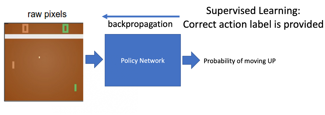 对于监督学习,我们可以直接告诉 agent 正确的标签是什么。但在这种游戏情况下面,我们并不知道它的正确的标签是什么。