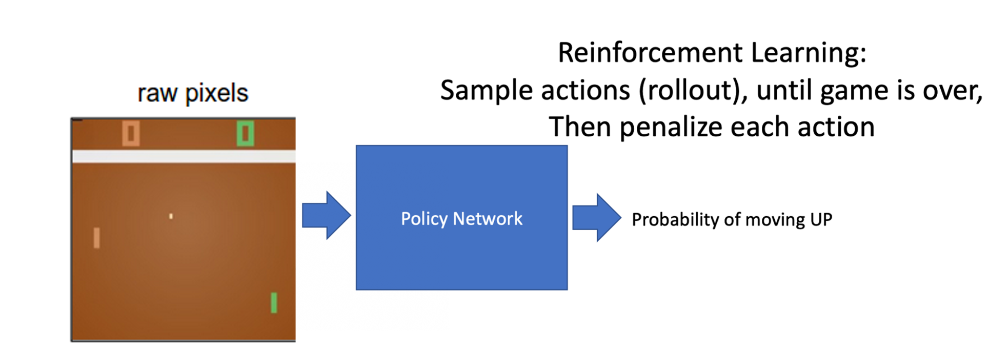 在这个 pong 的游戏里面,决策其实就是两个动作:往上或者往下。如果强化学习是通过学习一个 policy network 来分类的话,其实就是输入当前帧的图片,policy network 就会输出所有决策的可能性。