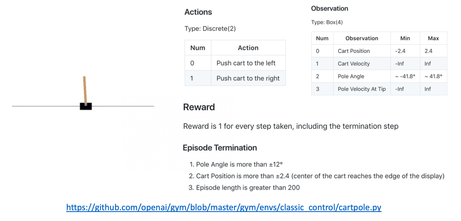 如果 observation 越详细,就可以更好地描述当前这个所有的状态。这里有 reward 的定义,如果能多保留一步,你就会得到一个奖励,所以你需要在尽可能多的时间存活来得到更多的奖励。当这个杆的角度大于某一个角度(没能保持平衡)或者这个车已经出到外面的时候,游戏就结束了,你就输了。所以这个 agent 的目的就是为了控制木棍,让它尽可能地保持平衡以及尽可能保持在这个环境的中央。