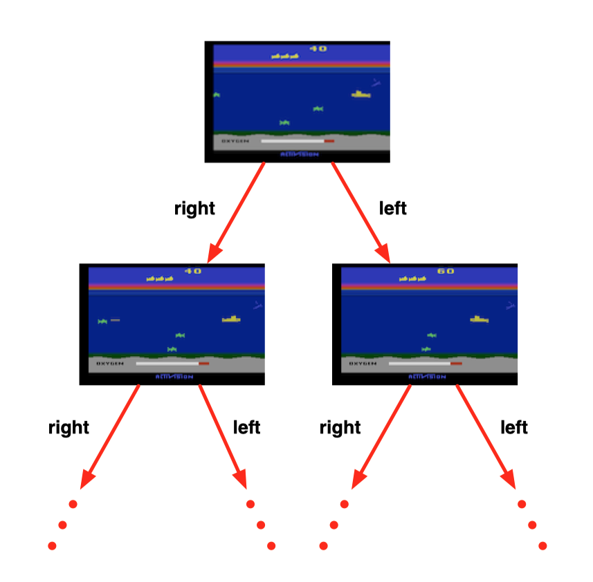 比如现在是在第三步,你把这个序列放进去,你希望这个网络可以输出一个决策,在当前的这个状态应该输出往右移或者往左移。这里有个问题:我们没有标签来说明你现在这个动作是正确还是错误,必须等到游戏结束才可能说明,这个游戏可能十秒过后才结束。现在这个动作到底对最后游戏结束能赢是否有帮助,其实是不清楚的。这里就面临延迟奖励(Delayed Reward),所以就使得训练这个网络非常困难。