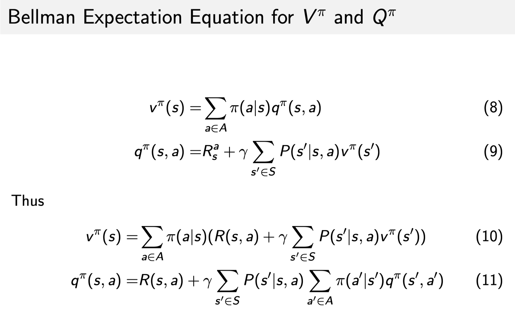 q^{*}(s, a)=R(s, a)+\gamma \sum_{s^{\prime} \in S} P\left(s^{\prime} \mid s, a\right) \max _{a^{\prime}} q^{*}\left(s^{\prime}, a^{\prime}\right)